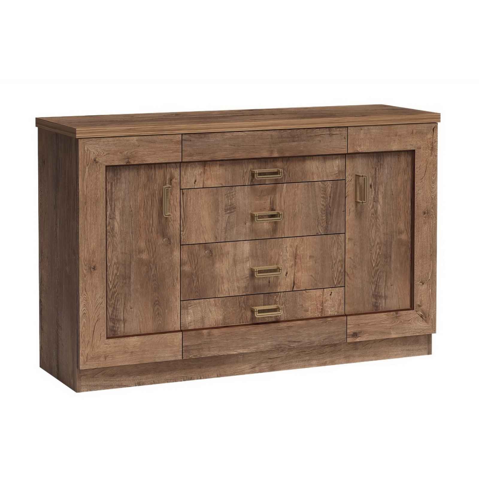 Komoda ze sektorové řady. Komoda má 2 dvířka a 4 praktické zásuvky, za dvířky je po 1 polici. Barva: dub lefkasRozměry (šířka x výška x hloubka): 140 x 90 x 44 cm. Systém je exkluzivní kolekce navržena v duchu vintage. Materiál: velmi kvalitní LTD o tloušťce 16 mm, horní deska zesílena na 32 mm, lišty na čele nábytku jsou MDF, hrany ABS Úchyty: kov Celá řada se vyznačuje elegancí a jednoduchými tvary, které zaručují plné využití prostoru. Dodáváme v demontovaném stavu.