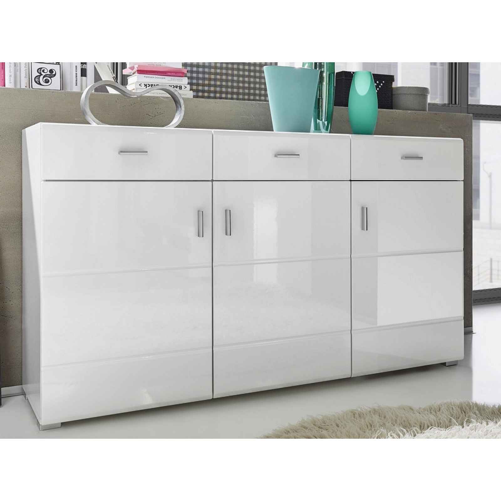Leskle bílou komodu můžete libovolně kombinovat s jakýmikoliv barvami a dekoracemi ve vašem interieru. - materiál: dřevotříska, MDF, kov, plast - dekor korpus: bílý mat - dekor přední plochy: bílý vysoký lesk - úchyty: šedá alu barva - přízemní nožky: šedá alu barva - dekorativně frézované linie předních ploch - univerzální bílá komoda - nábytek můžete libovolně kombinovat s jakýmikoliv barvami a dekoracemi ve vašem interieru - celková šířka: 150 cm - 3 zásuvky v horní části (kovové boční pojezdy) - 3 dveře v dolní části (uvnitř úložné prostory, 2 vnitřní police) - perokresba vnitřního prostoru viz fotogalerie - dodáváno v demontu