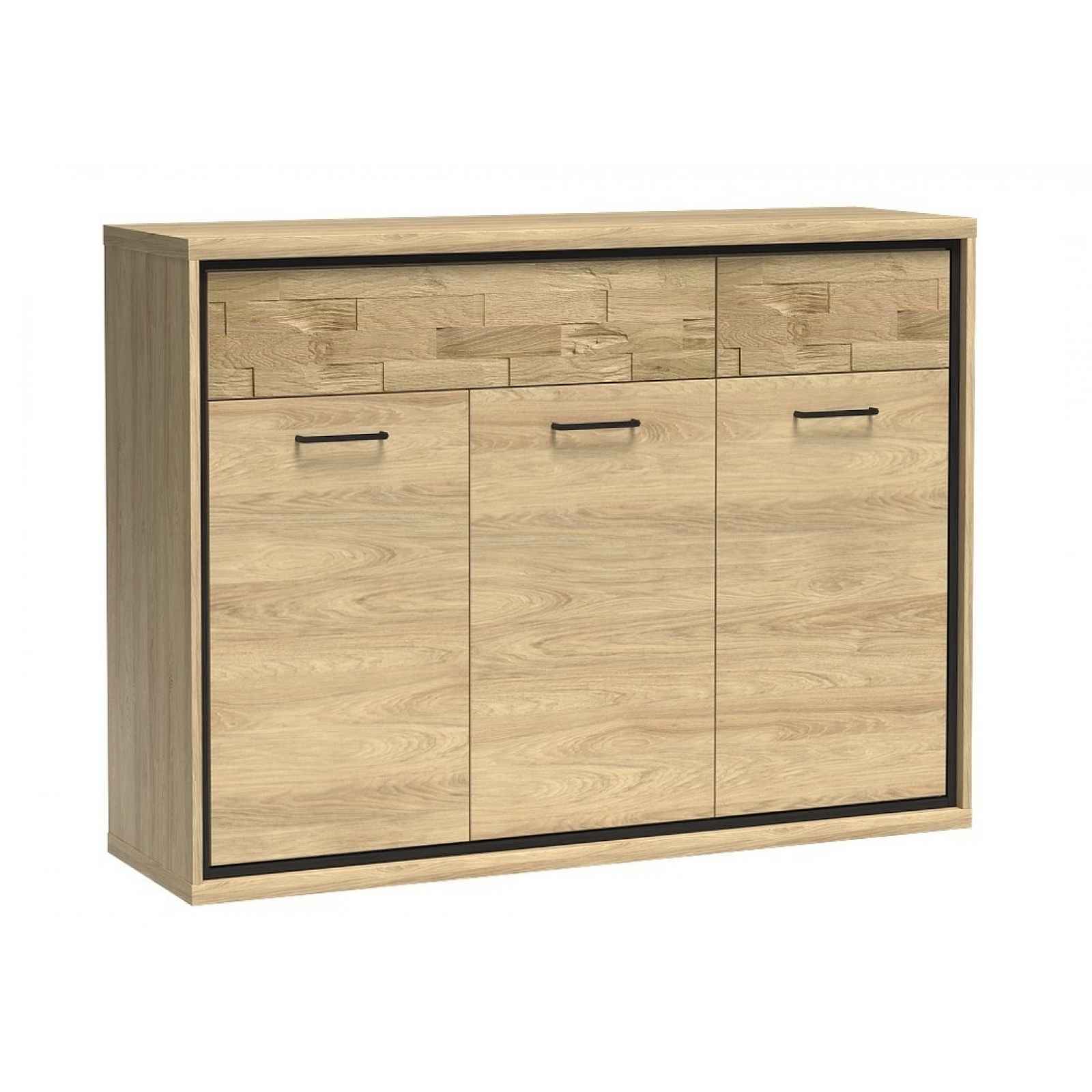 Komoda třídveřová se zásuvkami ze sektorové řady doplněna prvky v černé barvě.Zásuvka je doplněna dekorační dubovou deskou a systémem push to open - otvírání zmáčknutím zásuvky.LED osvětlení není v ceně.Barva: dub hickoryRozměry (šxvxh): 135 x 101 x 41 cmMateriál: kvalitní lamino ohraněné ABS páskouÚchyty: kovDodáváno v demontu.