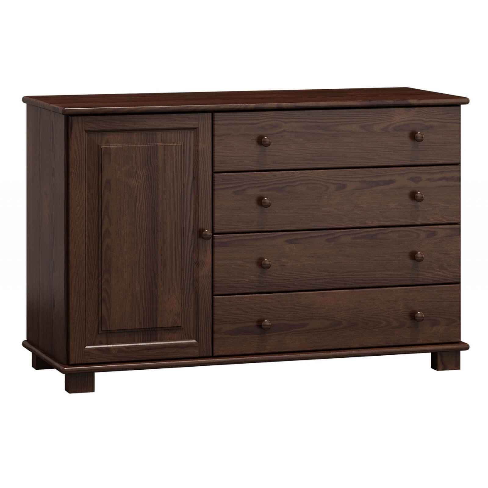 Kombinovaná komoda s dvířky a čtyřmi zásuvkami Materiál: masiv borovice Barva moření: ořech Rozměry (výška x šířka x hloubka): 78 x 118 x 47 cm Dodáváno v demontu.