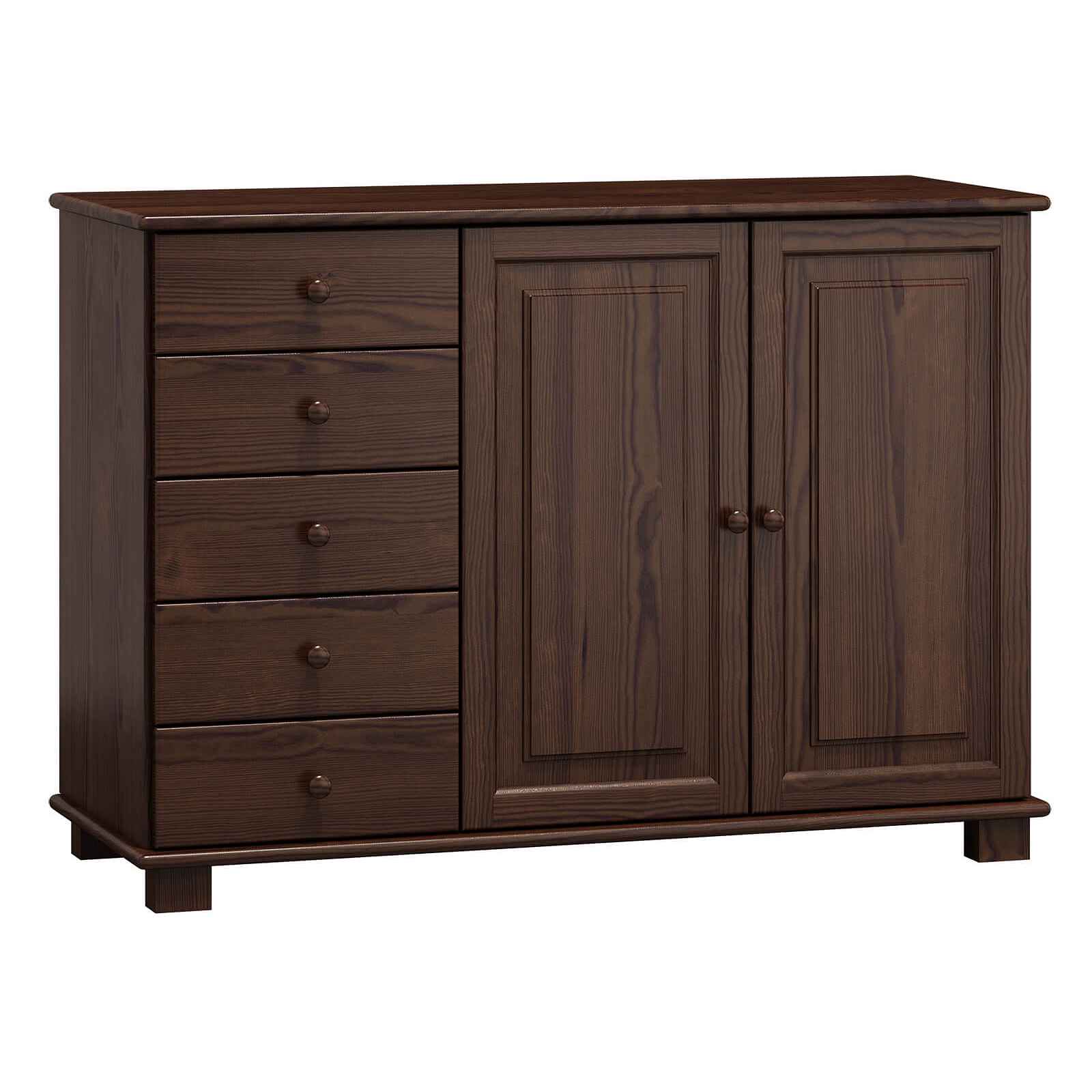 Kombinovaná komoda s pěti zásuvkami a dvěma dvířky Materiál: masiv borovice Barva moření: ořech Rozměry (výška x šířka x hloubka): 85 x 118 x 42 cm Dodáváno v demontu.