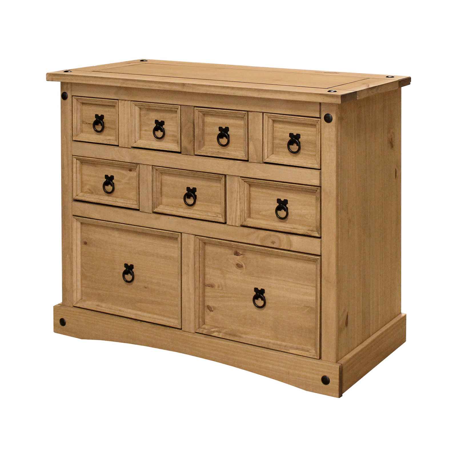 Komoda s 9 zásuvkami Barva: medový odstín Rozměr (šxvxh): 102 x 85 x 46 cm Materiál: masiv borovice - 4 malé, 3 střední a 2 velké zásuvky s kovovými úchytkami a pojezdy Dodání v demontu. Záruka 24 měsíců.
