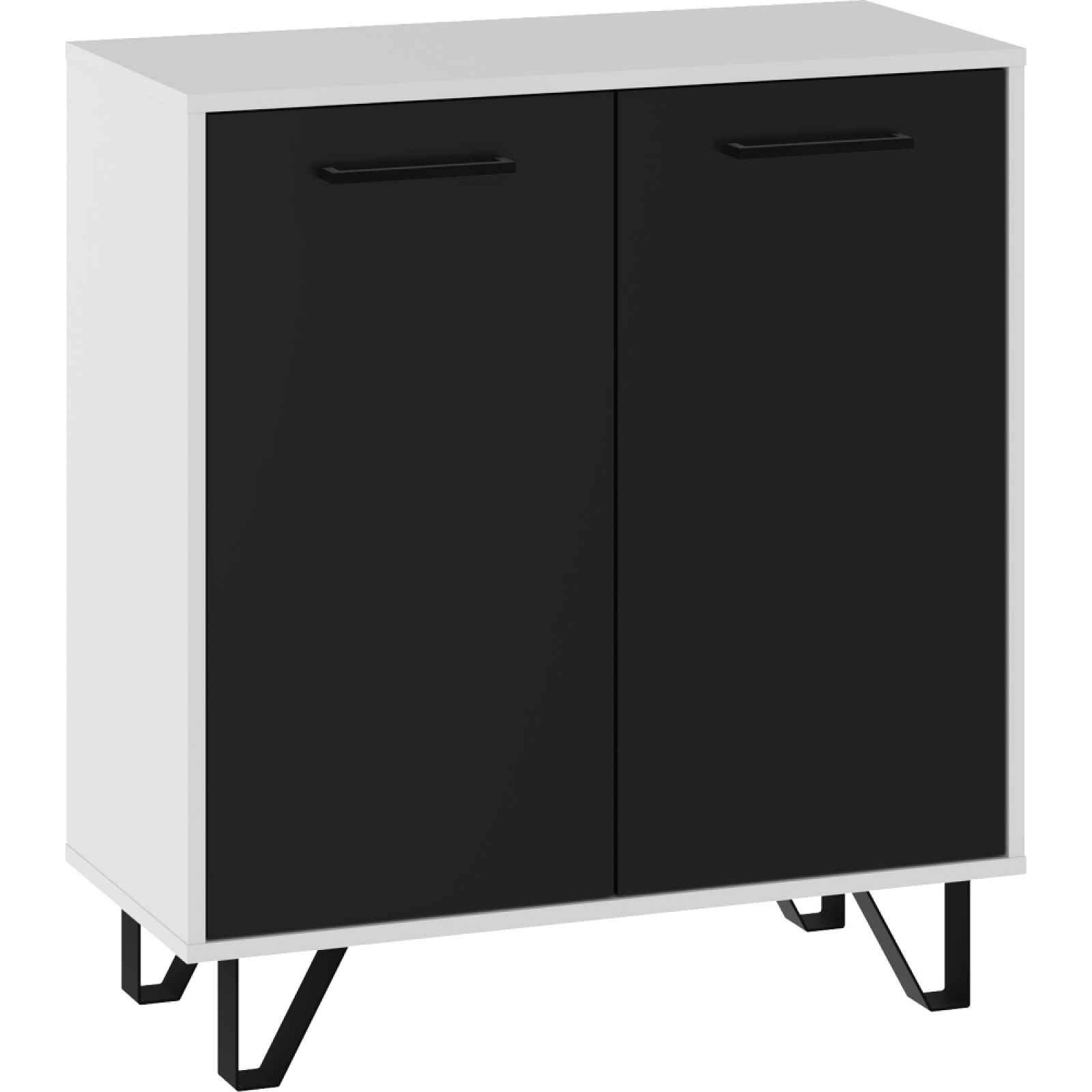 Policová komoda Barva: - bílá/černý lesk - nožky a úchytky: černá Rozměr (šxvxh): 80 x 87 x 39 cm Výška nožek: 12 cm Materiál: - lamino 16 mm, ABS hrany - nožky: kovNosnost:- horní deska: max. 20 kg- police: max. 5 kg Disponuje systémem tichého dovírání. Dodáváno v demontu. Záruka 5 let.