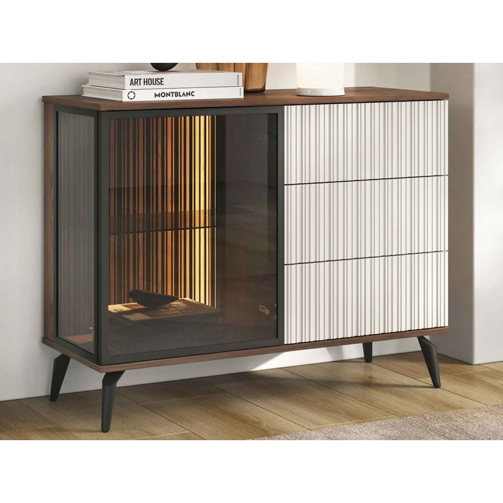 Komoda s prosklením z kolekce Vici - moderní nábytek v dekoru ořech s kašmírově béžovými plochami pro útulný interiér. Komoda s prosklením z kolekce Vici – stylový nábytek pro ty, kteří chtějí mít interiér zařízený moderně, prakticky a zároveň útulně. Hřejivý ořechový dřevodekor doplňují kašmírově béžové povrchy. Charakteristickým prvkem je profilace na předních plochách, které nábytku dodávají hloubku a originální texturu. Prosklená část s LED osvětlením nechá vyniknout vašim dekoracím a vytvoří v interiéru útulnou večerní atmosféru. Díky vysokým kovovým nožičkám působí skříňka lehce a umožňuje snadnou údržbu podlahy, včetně využití robotického vysavače. - komoda s prosklením z kolekce Vici - materiál: laminovaná dřevotříska 16 mm (ABS hrany), MDF 18 mm/21 mm, kov, tvrzené kouřové sklo antisol 4 mm - dekor: ořech/kašmírová béžová mat - profilované přední povrchy s lamelovým efektem - prosklení: tvrzené kouřové sklo, černý kovový rám - úchyt: bezúchytové otevírání Push to open - nožky: kov, černá, výška 15 cm (možné využít robotický vysavač) - včetně LED osvětlení (1 x světelná LED lišta, barva světla – teplá bílá, včetně trafa a přívodového kabelu, nášlapný vypínač) - moderní a zároveň útulný styl - šířka: 103 cm - 3 x zásuvka (kovové boční pojezdy, max. nosnost do 2 kg) - 1 x prosklené pravé dveře (úložný prostor, 1 x skleněná police do 2 kg, 1 x světelná LED lišta) - stabilní - doporučené ukotvení ke stěně - dodáváno v demontu
