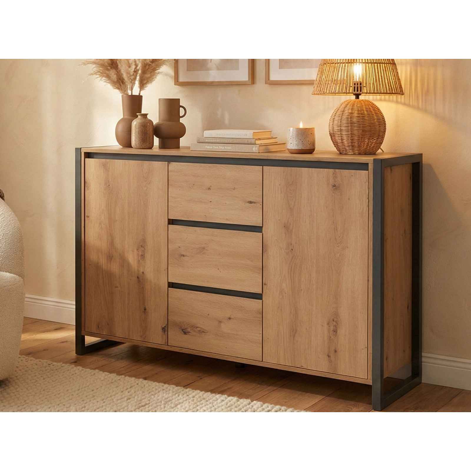 Komoda se zásuvkami z kolekce Denver - nábytek v městském industriálním stylu působí velmi moderně a dává Vám možnost vytvářet designové interiery v mladistvém duchu. Příjemné útulné tóny dřevodekoru dub artisan doplňují antracitově šedé linie a široké boční rámy, díky kterým je nábytek nezaměnitelný. - komoda se zásuvkami z kolekce Denver - materiál: laminovaná dřevotříska 15 mm (ABS hrany), MDF 15 mm (ABS hrany), kov - dekor: dub artisan/antracitově šedý mat - úchyt: bezúchytové otevírání horní hranou - podnož/boční rám: hranatý profil (MDF 3×3 cm), antracitově šedý mat - antracitově šedé linie - městský industriální styl - působí mladistvě - celková šířka skříňky: 122 cm - 1 x levé dveře (úložný prostor, 1 x police – výškově nastavitelná) - 3 x zásuvka (kovové boční pojezdy) - 1 x pravé dveře (úložný prostor, 1 x police – výškově nastavitelná) - stabilní konstrukce - vyrobeno v EU - dodáváno v demontu