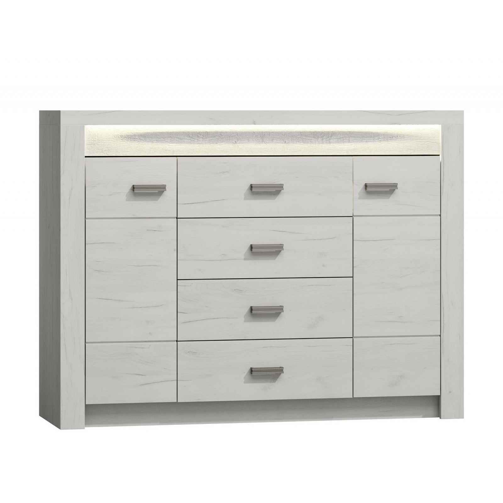 Kombinovaná komoda Tento sektorový systém je exkluzivní kolekce navržena v moderním duchu. Celá řada se vyznačuje elegancí a jednoduchými tvary, které zaručují plné využití prostoru. Komoda obsahuje 4 zásuvky, za dvířky jsou 2 police. Barevné provedení: jasan bílý Materiál: kvalitní lamino s ABS hrany ( 0,5-0,8 mm ), úchyty - kov Rozměr (šířka x výška x hloubka): 137 x 103,5 x 42 cm. Vsazením LED osvětlení do ozdobné rýhované lišty, které najdete v naší další nabídce, je zvýrazněn rustikální vzhled masivního dřeva. Dodáváme v demontovaném stavu.