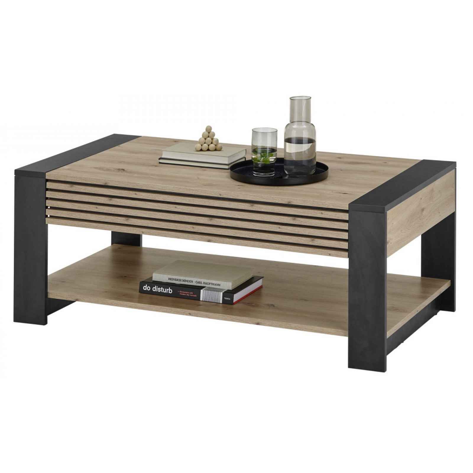 Obdélný konferenční stolek s úložnou zásuvkou v kombinaci dub artisan s černými povrchy a dekoračními lamelami vytváří působivý kontrast. Obdélný konferenční stolek o velikosti 110x60 cm v kombinaci dub artisan s černými povrchy a dekoračními lamelami vytváří působivý kontrast. U stolku oceníte praktickou úložnou zásuvku, která je nenápadně ukryta v bočním rámu a odkládací přihrádku, kam snadno odložíte časopisy, denní tisk, knížku nebo ovladače. - materiál: laminovaná dřevotříska 16 mm, kov, plast - dekor: dub artisan/černá mat - široká podnož - široký boční rám - dekorační lamely na bočních plochách - trendový styl - horní obdélná plocha: 110x60 cm - 1 x úložná zásuvka: ukryta v širokém bočním rámu, bezúchytové otevírání dolní hranou, vnitřní prostor 86×6×40 cm, ideální velikost pro uschování časopisů, ovladače televize nebo jiných drobností - 1 x dolní odkládací přihrádka (doporučená nosnost do 15 kg) - doporučená nosnost horní plochy do 15 kg - praktický a zajímavý na pohled - dodáváno v demontu