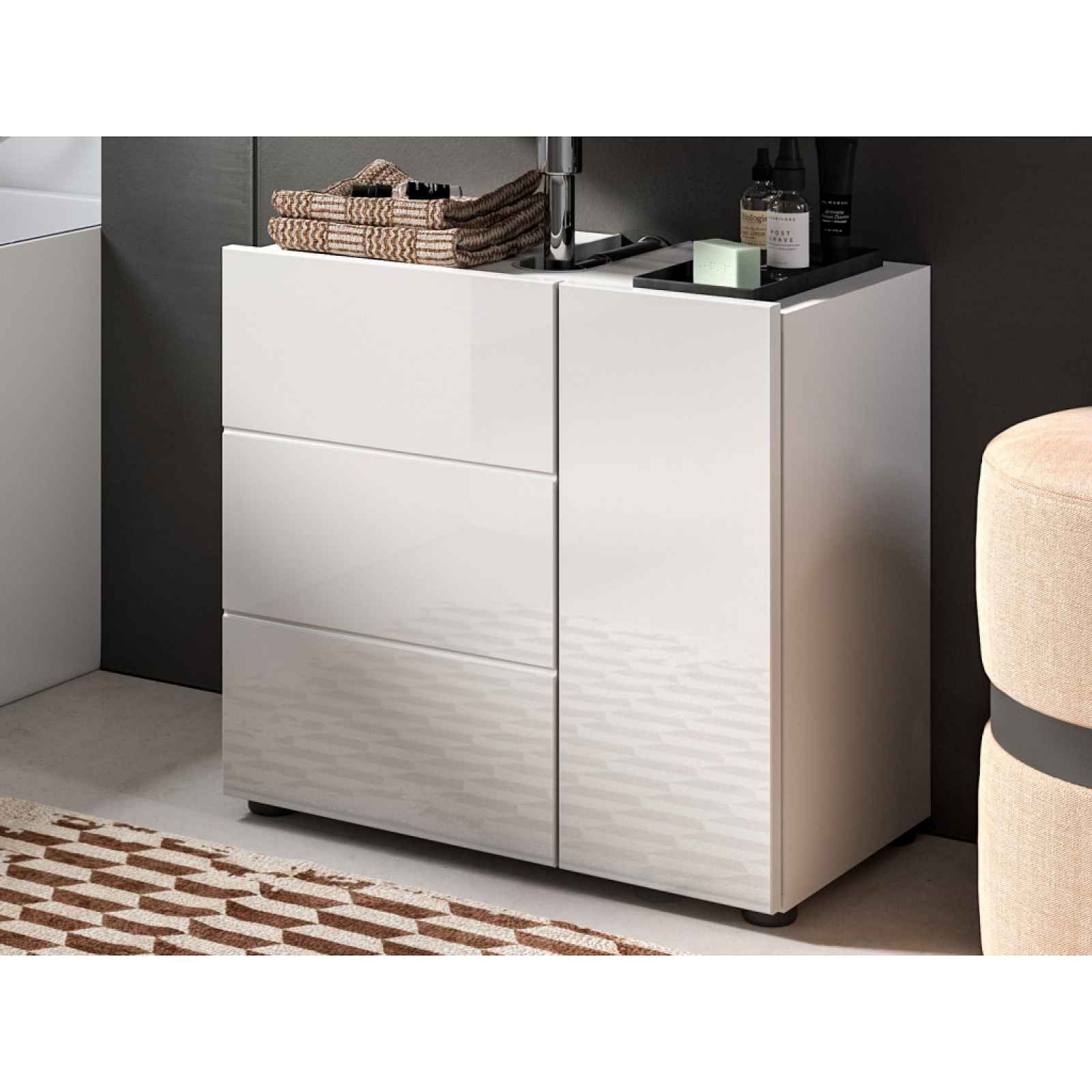 Koupelnová skříňka pod umyvadlo z programu Vira - nadčasový, minimalistický a zároveň funkční nábytek v kombinaci matných a leskle bílých ploch pasuje do každé koupelny. Koupelnová skříňka pod umyvadlo z programu Vira - nadčasový, minimalistický a zároveň funkční nábytek v kombinaci matných a leskle bílých ploch pasuje do každé moderní koupelny. Skříňka o šířce 60 cm je koncipována pro umístění pod umyvadlo, má 2 otočné dveře a vnitřní úložný prostor pro uschování koupelnových potřeb, ručníků, kosmetiky a další toaletních potřeb. - koupelnová skříňka pod umyvadlo z programu Vira - materiál: laminovaná dřevotříska 16 mm, MDF 16 mm, kov, plast - dekor korpus: bílá mat - dekor přední plochy: bílá lesk - úchyt: bezúchytové otevírání boční hranou - nožky: kluzáky, plast, černé, výška 20 mm - frézované linie přední plochy - moderní minimalistický styl - šířka: 60 cm - 2 x dveře (úložný prostor, 1 x police - výškově nastavitelná, doporučená nosnost do 5 kg) - zadní strana: částečně otevřena (pro protažení odtokové trubice) - horní strana: otevřený průřez (velikost 9×21 cm, pro protažení odtokové trubice) - certifikát výrobku FSC (dřevěný materiál pocházející z ekologicky obhospodařených certifikovaných lesů) - kvalita/péče: kvalitní materiály a solidní zpracování zajišťují dlouhou životnost, vhodné pro používání ve vlhkém prostředí koupelny, povrchy se snadno udržují a čistí, což umožňuje dlouhodobé používání a snadnou údržbu - dodáváno v demontu