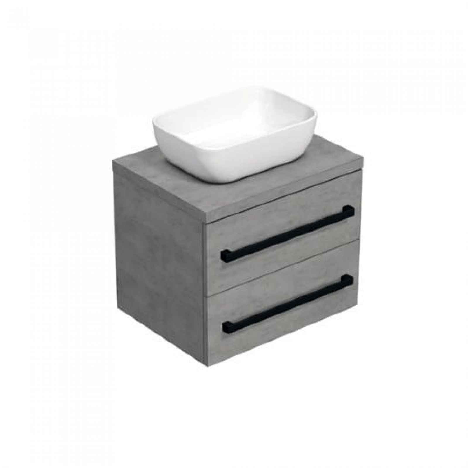 Závěsná koupelnová skříňka s černou úchytkou a keramickým umyvadlem v imitaci betonu s matným povrchem o rozměru 60x47,5x46 cm. Povrch v provedení lamino.
