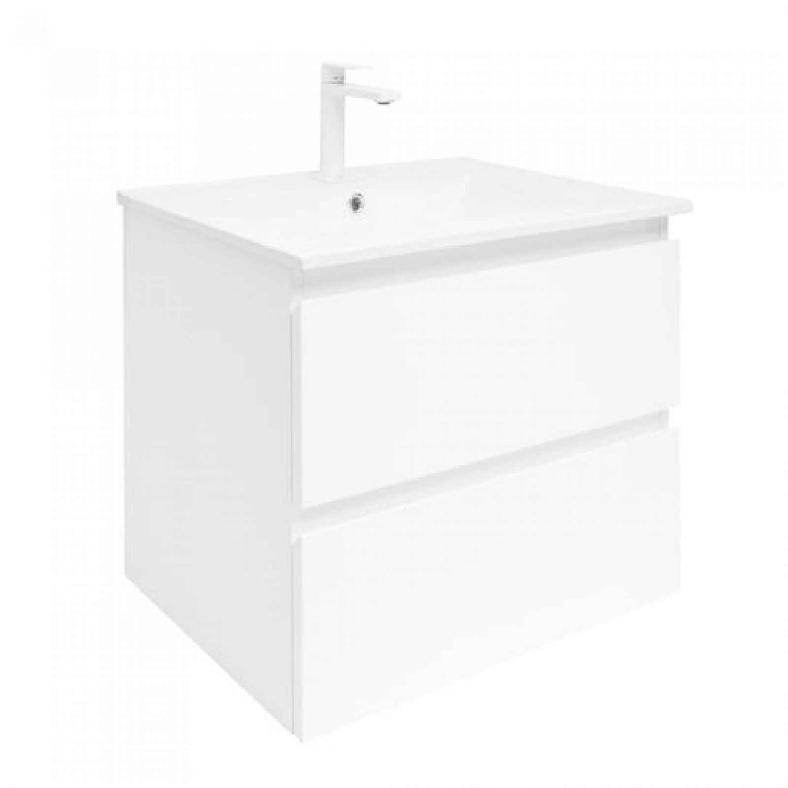 Závěsná koupelnová skříňka s krycí deskou v bílé barvě s lesklým povrchem o rozměru 59x50x45 cm. Povrch v provedení lamino.