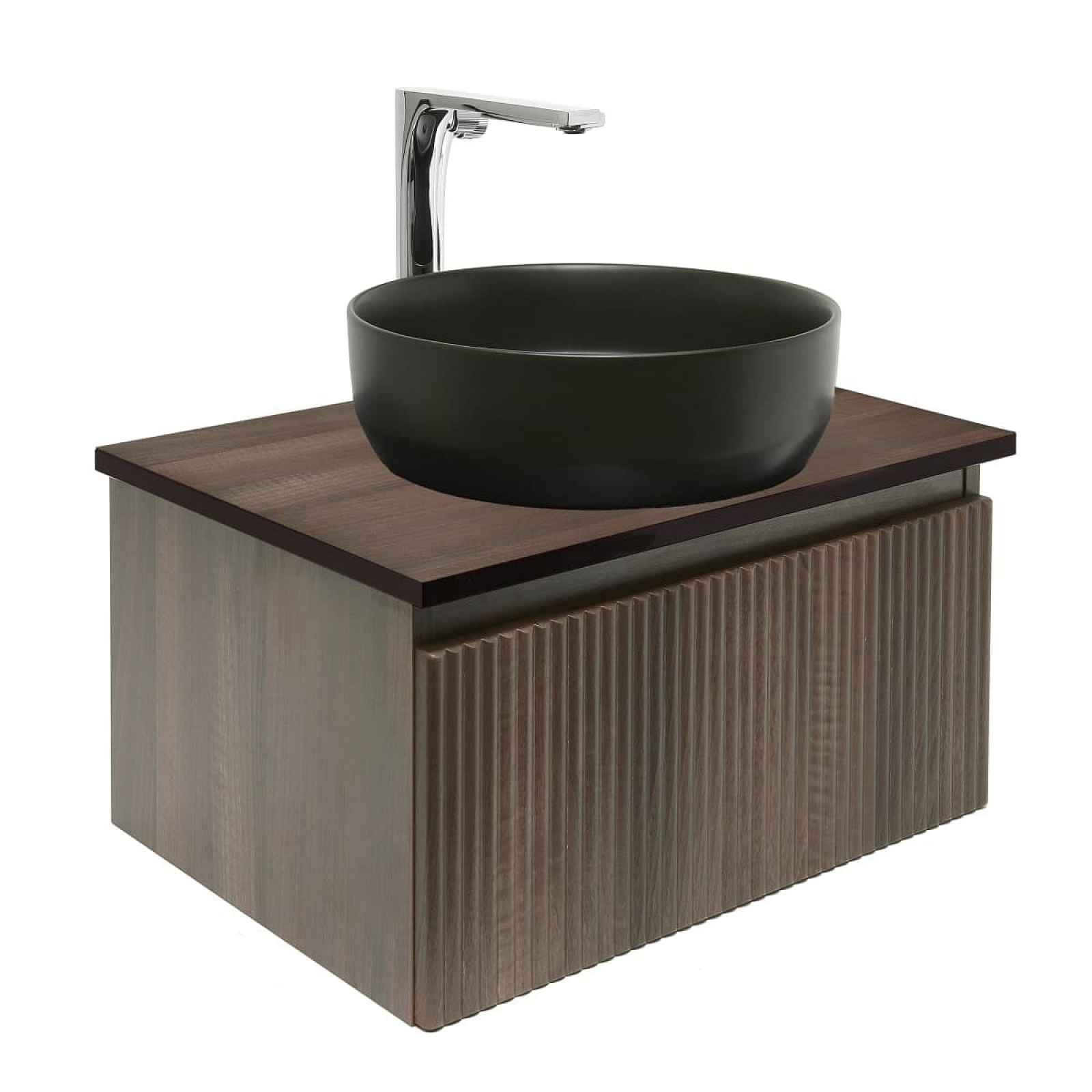 Závěsná koupelnová skříňka s keramickým umyvadlem a baterií v dekoru ořech s matným povrchem o rozměru 58x30x44,8 cm. Povrch v provedení lamino.