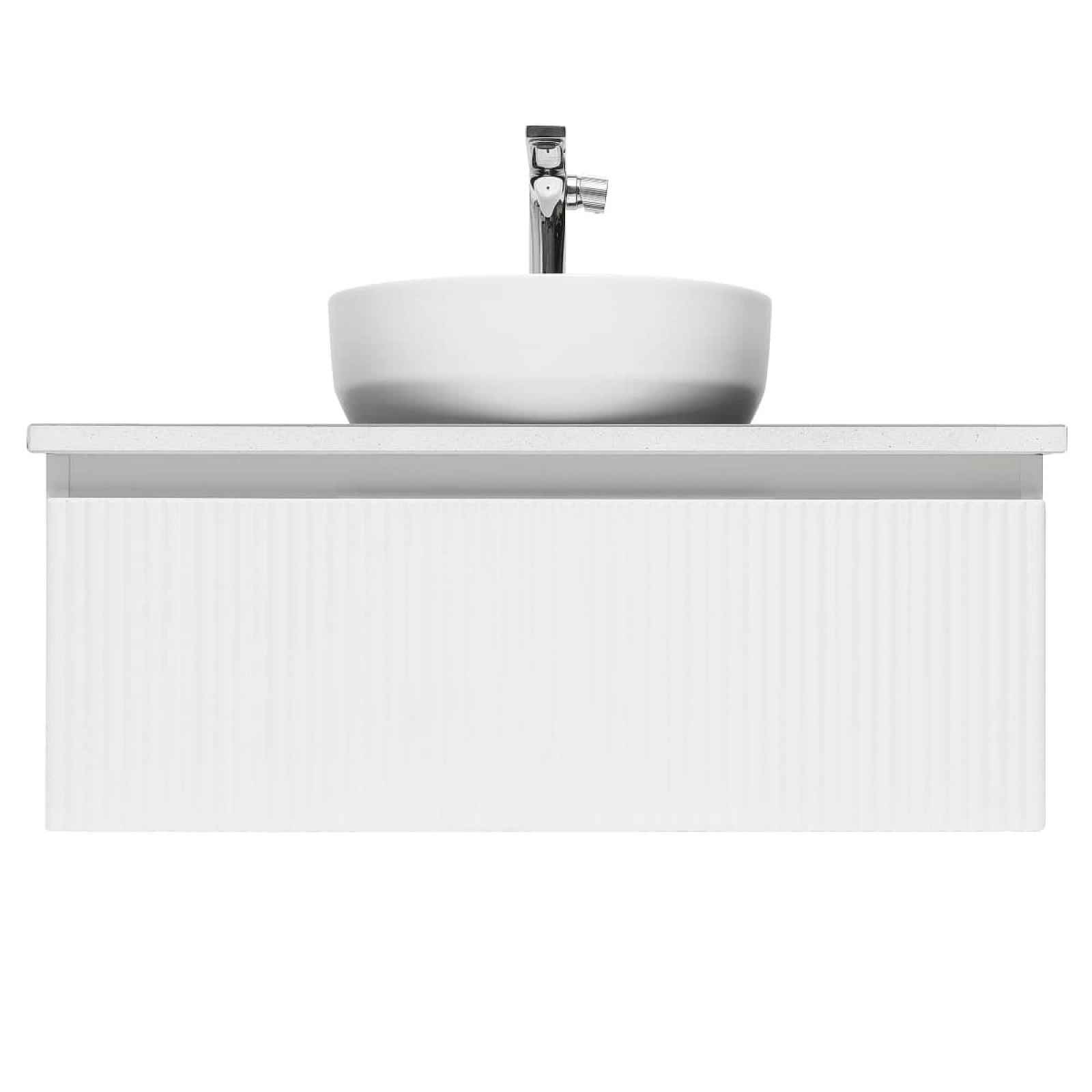 Závěsná koupelnová skříňka s keramickým umyvadlem a baterií v bílé barvě s matným povrchem o rozměru 98x30x44,8 cm. Povrch v provedení lamino.