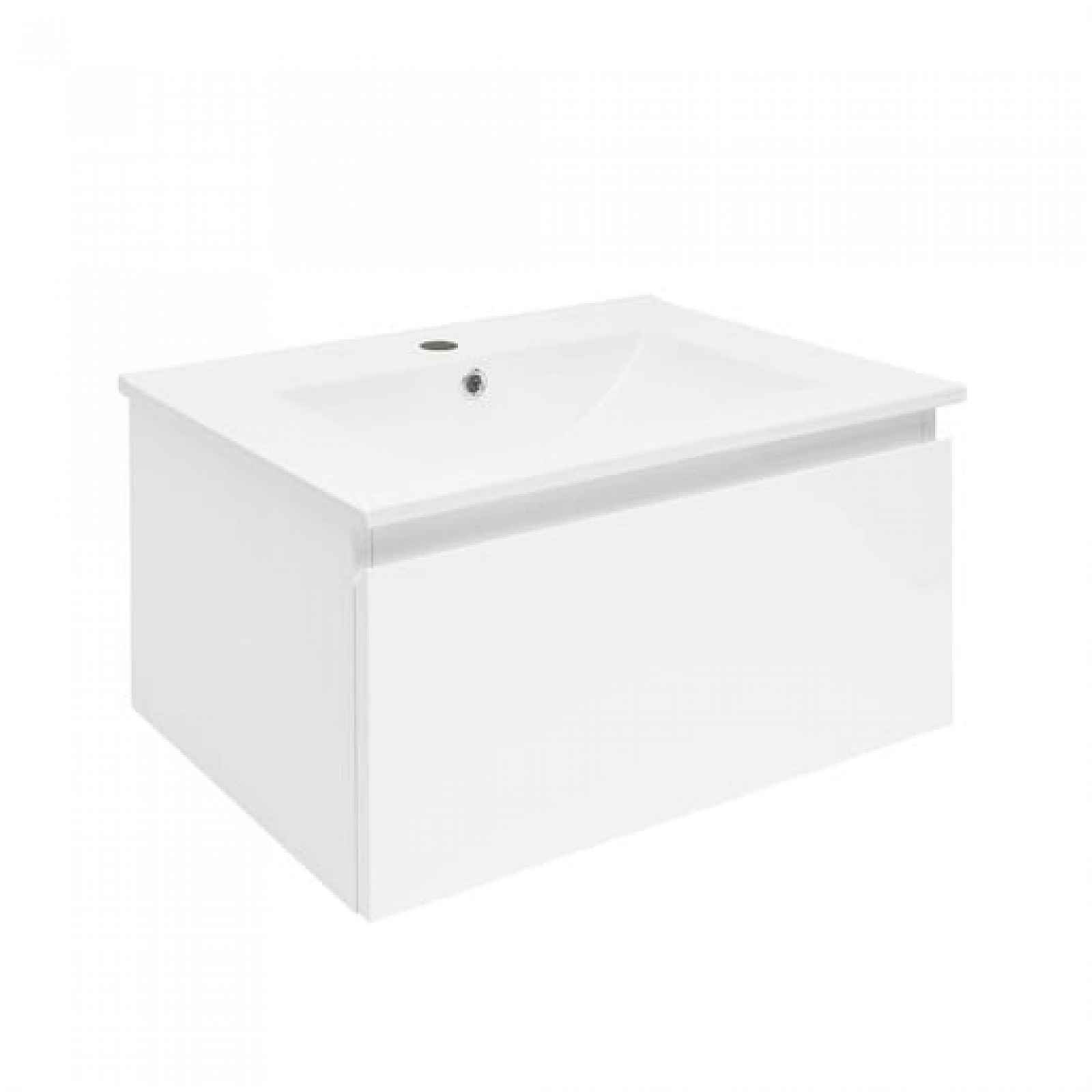 Závěsná koupelnová skříňka s keramickým umyvadlem v bílé barvě v lesklém provedení o rozměru 59x30x45 cm. Povrch v provedení lamino.