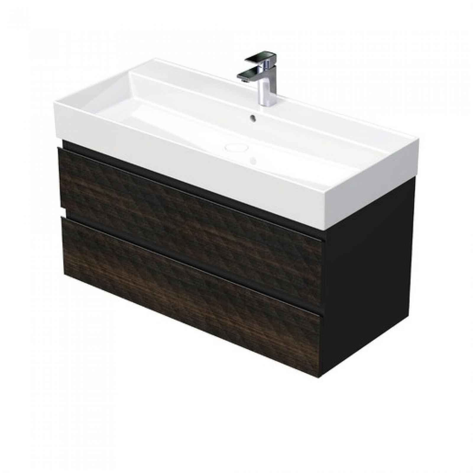 Závěsná koupelnová skříňka s keramickým umyvadlem v hnědé barvě s matným povrchem o rozměru 100x47,5x46 cm. Povrch v provedení lamino. S plnovýsuvem a dotahem.