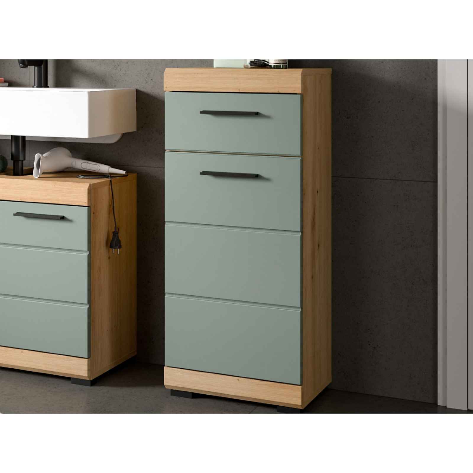 Koupelnová stojací skříňka z programu Scout - moderní, elegantní a praktický nábytek do koupelny v kombinaci dub artisan s matně šalvějově zelenými plochami. Koupelnová stojací skříňka z programu Scout - moderní, elegantní a zároveň praktický nábytek do koupelny v kombinaci dub artisan s matně šalvějově zelenými plochami. Přední plochy se zkosenou hranou a decentně frézovanými liniemi jsou příjemným detailem. - koupelnová stojací skříňka z programu Scout - materiál: laminovaná dřevotříska 16 mm, MDF 16 mm, kov, plast - dekor korpus: dub artisan - dekor přední plochy: šalvějově zelená mat - úchyt: plast, černá mat - nožky: plast, černá, výška 20 mm - zkosená hrana předního rámu - frézované linie přední plochy - moderní a elegantní styl - 1 x zásuvka (kovové boční pojezdy) - 1 x dveře (uni montáž pravé/levé, úložný prostor, 1 x police) - certifikát výrobku FSC (dřevěný materiál pocházející z ekologicky obhospodařených certifikovaných lesů) - kvalita/péče: kvalitní materiály a solidní zpracování zajišťují dlouhou životnost a stabilitu, povrchy se snadno udržují a čistí, což umožňuje dlouhodobé používání a snadnou údržbu - dodáváno v demontu