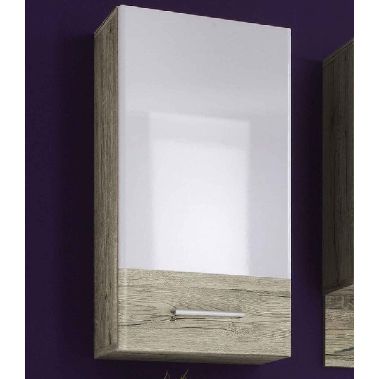Koupelnová závěsná skříňka z kolekce Barolo se vyznačuje zaoblenými hranami předních ploch - pro elegantní, praktickou a zároveň moderně zařízenou koupelnu. Vyrobena v kombinaci dub san remo/bílý vysoký lesk. - koupelnová závěsná skříňka z programu Barolo - materiál: dřevotříska 15 mm, MDF, kov, plast - dekor korpus: dub san remo - dekor přední plochy: dub san remo/bílý vysoký lesk - úchyt: vodorovní profil, tvrzený plast, šedá alu barva - elegantně zaoblené hrany předních ploch - pro zavěšení na stěnu (zadní 2-bodové zavěšení) - 1 x levé dveře (uvnitř úložný prostor, 1 x police - doporučená nosnost do 7 kg) - dodáváno v demontu