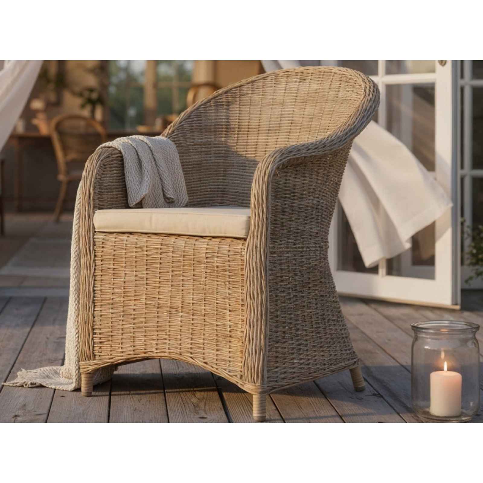 Elegantní zaoblené křeslo z umělé imitace ratanu přináší dokonalé spojení stylu, pohodlí a praktičnosti. Díky odolnému materiálu se hodí na zahradu i do bytu. Elegantní zaoblené křeslo z umělé imitace ratanu přináší dokonalé spojení stylu, pohodlí a praktičnosti. Jeho jemně tvarovaná silueta působí vzdušně a nadčasově, zatímco jeho výplet dodává nádech tradice inspirované přírodními materiály. Součástí křesla je světle béžový polstr, který zajišťuje příjemný komfort při sezení. Ergonomicky tvarované opěradlo poskytuje pohodlí například při posezení u kávy, rodinného oběda nebo večerního posezení s přáteli. Díky odolné imitaci ratanu je křeslo navrženo tak, aby bez obav čelilo povětrnostním vlivům – slunci, větru i lehkému dešti. Skvěle se proto hodí na zahradu, terasu či balkon, kde vytvoří příjemné místo k odpočinku. Stejně působivě však vynikne i v interiéru, kde se stane elegantním doplňkem obývacího pokoje, zimní zahrady, chodby nebo jídelny. Křeslo můžete umístit samostatně jako stylový solitér, nebo jej zakomponovat k jídelnímu stolu. Ať už ho postavíte kamkoliv, vždy dodá prostoru nádech elegance a útulnosti. - stabilní konstrukce: kov - povrchová úprava: černý lak - povrch/výplet: imitace umělého ratanu (PE), barva: přírodní béžová - umělý ratan dobře odolává nepříznivým vlivům počasí, proto je vhodný pro využití ve venkovním prostředí - elegantní styl - zaoblené opěradlo - boční područky - 1 x sedací polstr (polyuretanová výplň, polyesterová látka, barva světle béžová, snímatelný potah na zip, výška cca 6 cm) - výška sedu (s polstrem): cca 50 cm - hloubka sedu: cca 49 cm - na venkovní zahradu, terasu, zimní zahradu i do interieru bytu - doporučená nosnost do 110 kg - dodáváno smontované