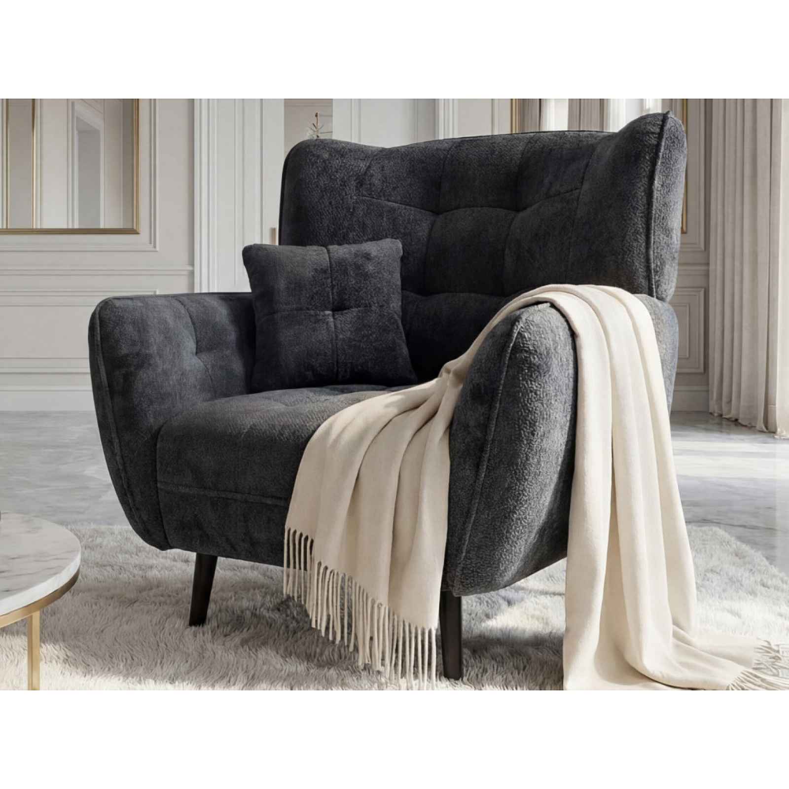 Stylové křeslo vyniká elegantním designem a vysokým komfortem, který oceníte při každý den. Vysoké opěradlo poskytuje skvělou oporu pro záda i hlavu. Stylové křeslo vyniká elegantním designem a vysokým komfortem, který oceníte při každodenním odpočinku. Bohaté vypolstrování spolu s vysokým opěradlem poskytuje skvělou oporu pro záda i hlavu, takže si můžete dopřát maximální pohodlí při relaxaci, sledování televize nebo posezení s rodinou. Na první pohled zaujme svými jemně zaoblenými tvary a výrazným prošíváním, které dodává křeslu luxusní a stylový vzhled. Díky tomu se stane výrazným designovým prvkem každého obývacího pokoje a snadno doplní moderní i elegantně laděný interiér. Stabilitu a zároveň vzdušný vzhled zajišťuje černá podnož z masivního dřeva, která křeslu dodává pevnost a přirozený charakter. Toto křeslo je očalouněno příjemně měkkou žinilkovou látkou v antracitově šedé barvě, která je nejen elegantní, ale také příjemná na dotek. - křeslo - konstrukce: dřevo, dřevotříska, překližka, kov - jádro: vlnovcové pružiny, studená pěna, čalounický flís - potah: látka 6160 - žinilková látka s jemně měkkou strukturou, barva antracitově šedá (složení: 100% polyester) - včetně potažení zadní části (možné umístění i v prostoru) - výrazný okrasný prošev potahu - látkové lemy - 1 x polštářek (na zip, cca 35x35 cm) - zaoblené tvary - elegantní luxusní styl - zaoblené boční područky (výška 67 cm) - sedák: středně měkký, prostorný, vyšší (kvalitní výplň ze studené pěny) - opěrák: středně měkký, pohodlný sklon, vysoký = opora krku/hlavy - nohy: masivní dřevo, barva černá, výška 18 cm - výška sedu: 47 cm - hloubka sedu: 65 cm - výška opěradla: cca 60 cm - šířka sedáku: 60 cm - do moderního i klasického interieru - kvalitní zpracování - dodáváno v částečném demontu