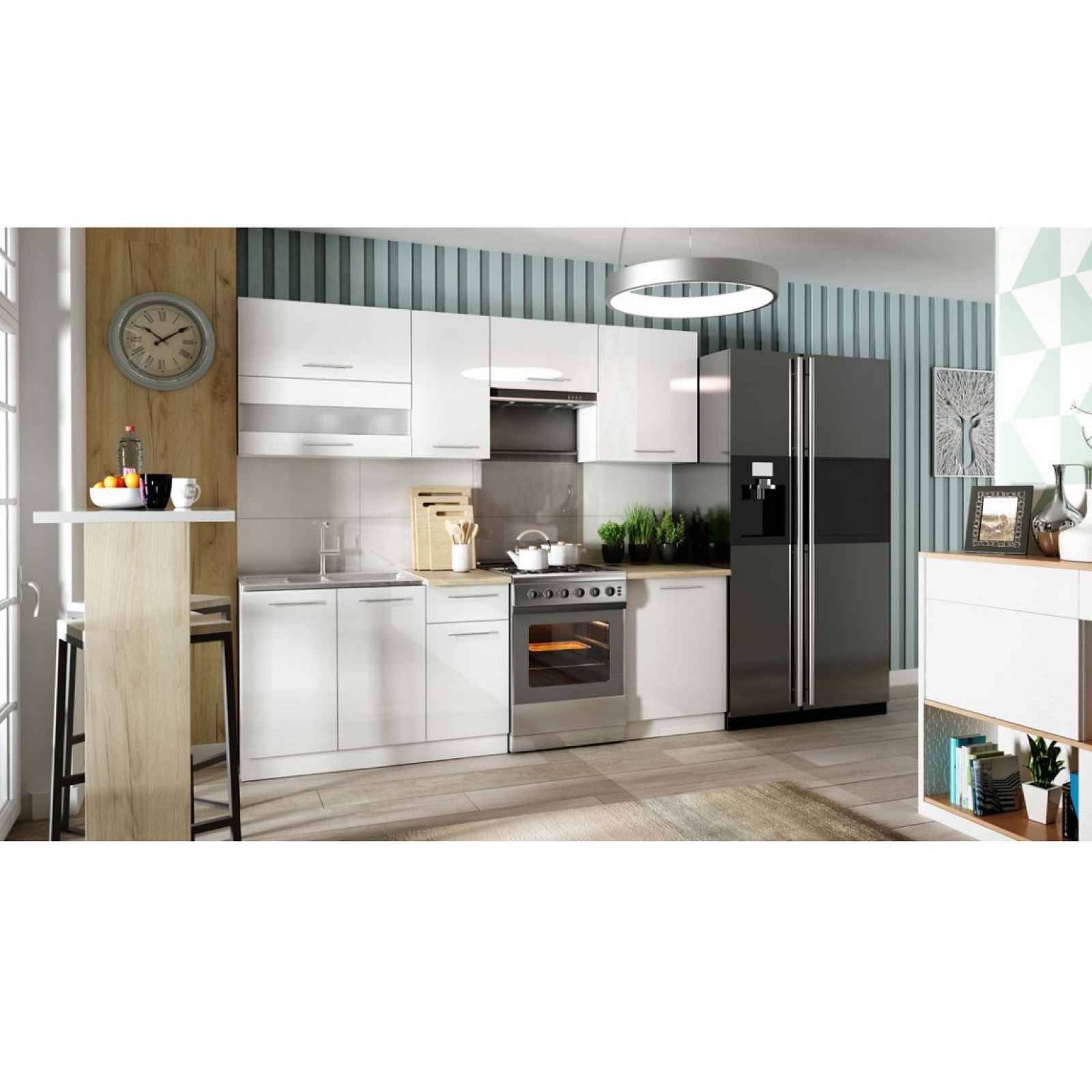 Kuchyňská sestava Barva: korpus - bílá, dvířka - bílý lesk Rozměry: - délka: 180/240 cm - dolní skříňky: výška 82 cm (v případě umístění pracovní desky tloušťky 28 mm), hloubka 52 cm, šířky - skříňka dřezová 80 cm, skříňka se šuplíkem 40 cm, skříňka 60 cm - horní skříňky: výška 72 cm, hloubka 30 cm, šířky - skříňka 40 cm, vitrína 80 cm, skříňka 60 cm, skříňka nad digestoř 60 cm Korpus je vyrobený z lamina o tloušťce 16 mm, ABS hrana 0,5 mm. Vnitřní poličky jsou vyrobeny z lamina o tloušťce 16 mm. Přední plochy dvířek a zásuvek jsou vyrobeny z MDF o tloušťce 16 mm a potaženy PVC fólií. Závěsy průměr 35 mm jsou regulovatelné ve třech osách. Úchytky jsou kovové. Nohy jsou plastové a výškově nastavitelné. Systém tichého dovírání dveří a zásuvek ve standardu. Temperované sklo předních ploch. Součástí kuchyňské linky nejsou sokly a pracovní deska. V ceně kuchyně není dřez a spotřebiče. Dodává se v demontu.