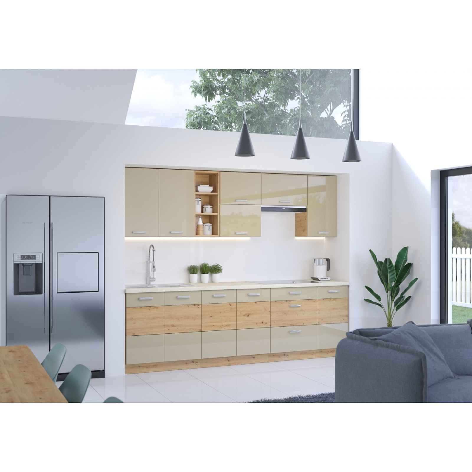 Kuchyně MEADOW 260 cm - dolní řada: 260 cm - horní řada: 260 cm Uvádíme pouze jako ilustrativní příklad jedné z možných sestav, kterou lze poskládat z jednotlivých skříněk. Jednotlivé skříňky si je možno vybrat a koupit každou zvlášť. Rozměry: - dolní skříňky: výška 82 cm, hloubka 52 cm, šířky: 80 cm - skříňka pod dřez 80 ZL 2F BB 80 cm - skříňka dolní 80 D 2F BB 60 cm - skříňka dolní 60 D 3S BB 40 cm - skříňka dolní 40 D 1F BB - horní skříňky: výška 71,5 cm, hloubka 31 cm, šířky: 80 cm - skříňka horní 80 G-72 2F 30 cm - horní regál 30 G-90 OTW 50 cm - skříňka horní 50 GU-36 1F - 2 ks 60 cm - skříňka horní 60 GU-36 1F 40 cm - skříňka horní 40 G-72 1F Vlastnosti skříněk: - mají systém tichého dovírání dvířek a zásuvek - zásuvky mají plný výsuv - jsou bez pracovní desky Barva: - korpus: dub artisan - dvířka: dub artisan, cappuccino lesk Materiál: - korpus: lamino, melaminové hrany, záda korpusu HDF - dvířka: lamino, MDF, ABS hrany - úchyt: kov - zásuvky: PREMIUM BOX Dodáváno v demontu.