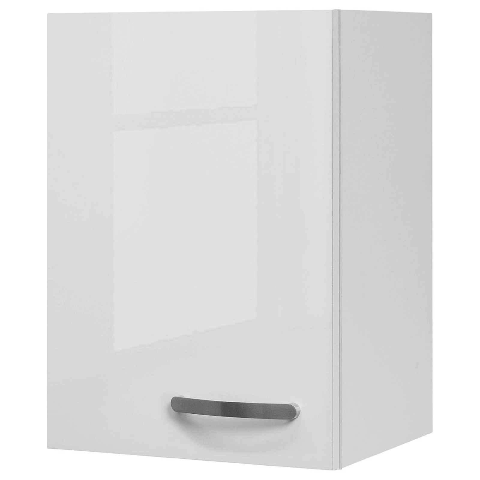 Horní kuchyňská skříňka v bílé barvě s vysokým leskem, s 1 otočnými dveřmi, 1 vkládací policí, úchyty v barvě nerezu. Š/V/H: cca 40/54/32 cm