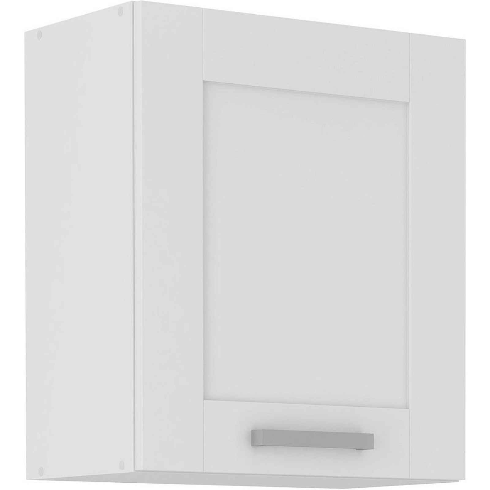 Horní skřínka v bílé matné barvě, 1 otoční dveře, 1 vkládací police, tlumené zavírání dveří, kovové úchytky. Š/V/H: cca 50/58/31 cm