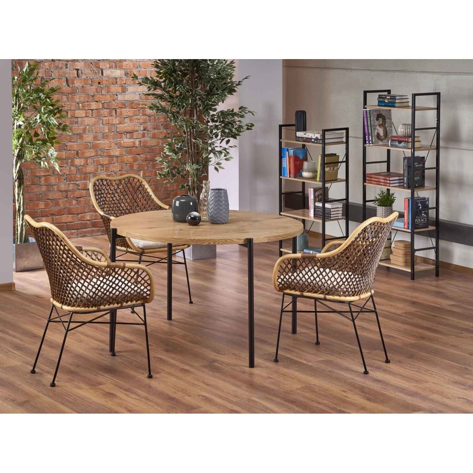 Kulatý jídelní stůl Barva: dub zlatý, černá Rozměry (průměr x výška): 120 x 76 cm Materiál: laminovaná MDF, lakovaná práškovaná ocel Židle nejsou v ceně. Dodání v demontu Záruka 24 měsíců.