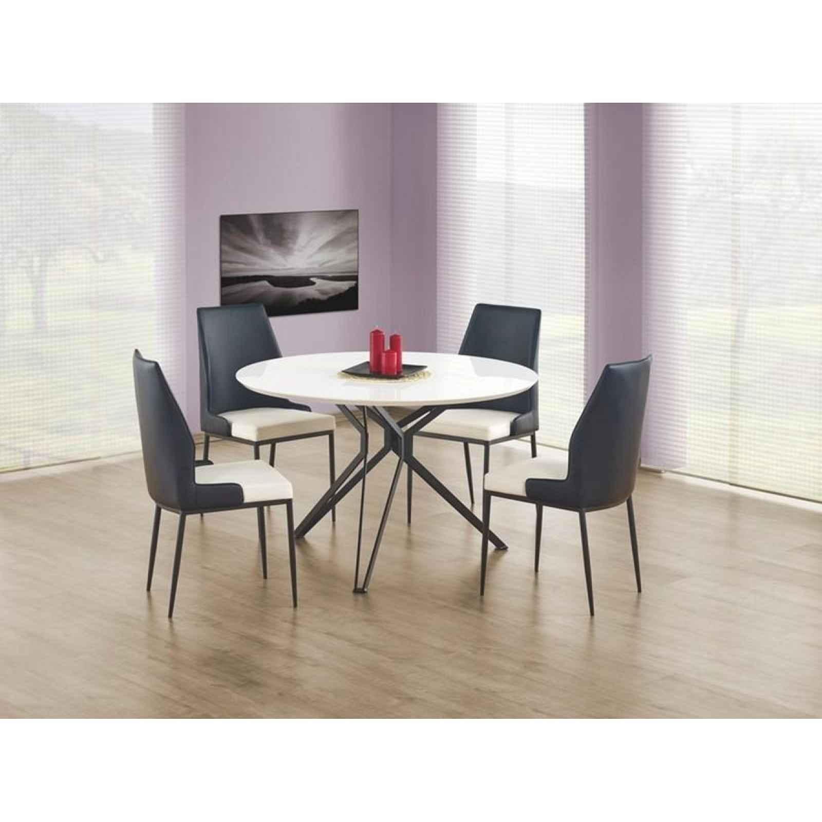 Kulatý jídelní stůl Materiál: deska stolu - lakovaná MDF, nohy - práškovaná ocel. Rozměry: průměr 120 cm, výška 76 cm. Židle nejsou v ceně. Dodání v demontu. Záruka 24 měsíců.