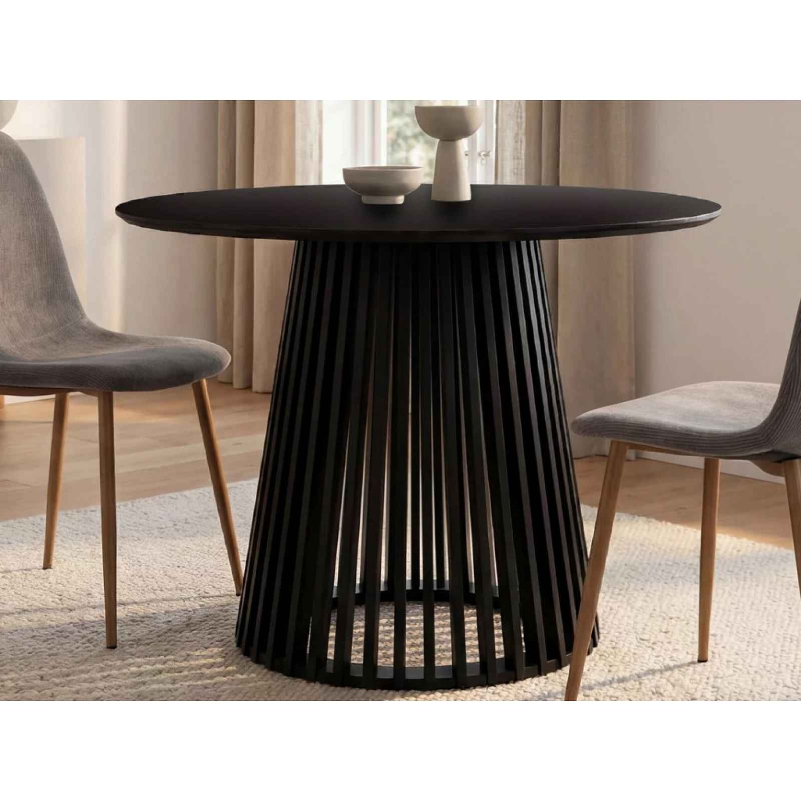 Atraktivní kulatý jídelní stůl v černé barvě má průměr 100 cm a zaujme lamelovým designem podstavy. Stane se tak stylovým středobodem vaší jídelny. Atraktivní kulatý jídelní stůl v černé barvě má průměr 100 cm a zaujme lamelovým designem podstavy. Podstava ve tvaru kuželu zajišťuje stabilitu během každodenního využívání a zároveň působí v interieru vzdušným dojmem. Tento krásný elegantní stůl se tak stane stylovým středobodem prostoru vaší jídelny. - materiál: MDF, kov - průměr podstavy: 60 cm - podnož: MDF, lamely, tvar kuželu - dekor: černá mat - lamelový design - tvar: kulatý - horní plocha: MDF deska - průměr jídelní plochy: 100 cm - zkosené boční hrany - elegantní nadčasový styl - zaujme na pohled - stabilní - dodáváno v demontu