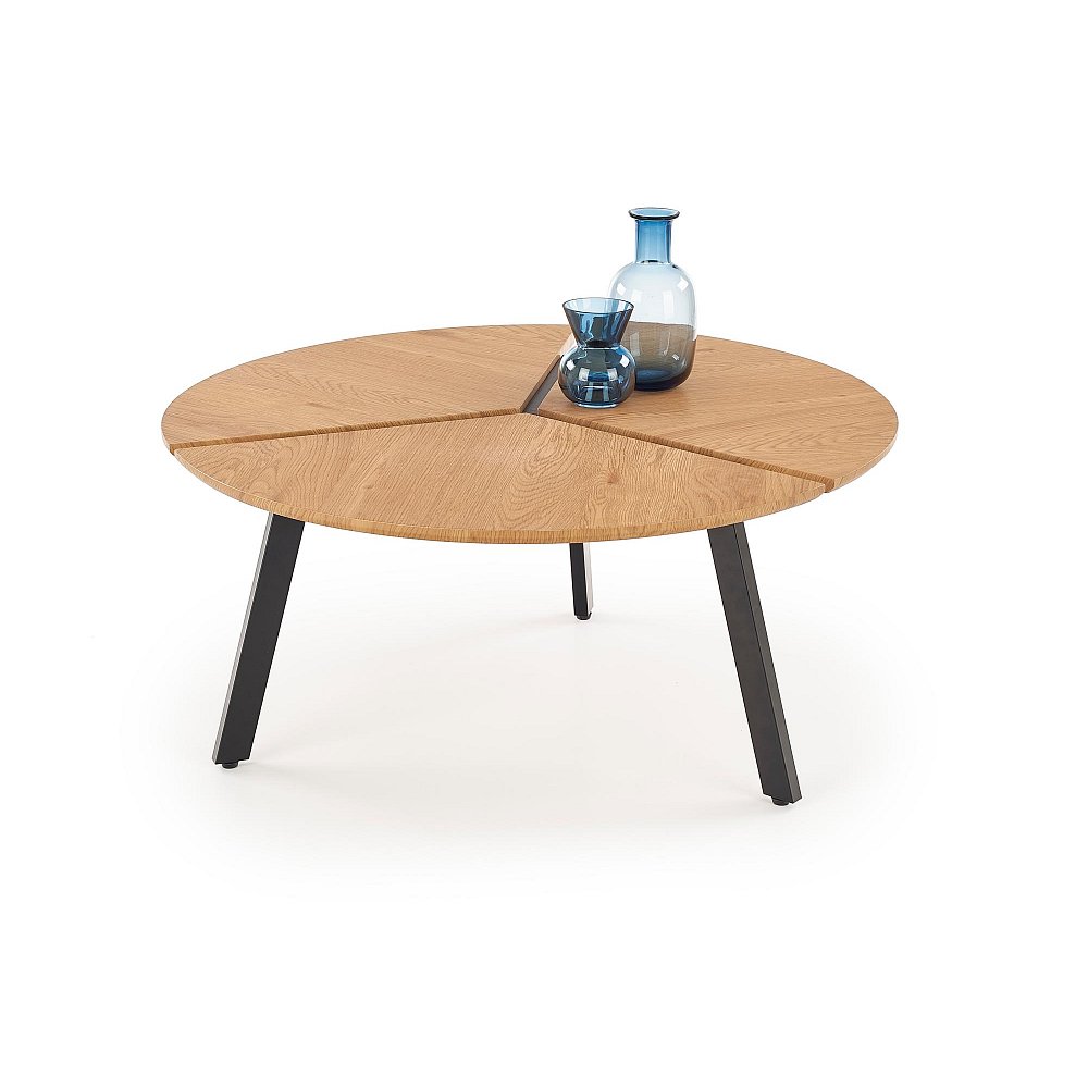 Kulatý konferenční stolek Barva: dub zlatý/černá Rozměry (průměr x výška): 86 x 40 cm Materiál: laminovaná MDF, lakovaná práškovaná ocel Dodání v demontu Záruka 24 měsíců.