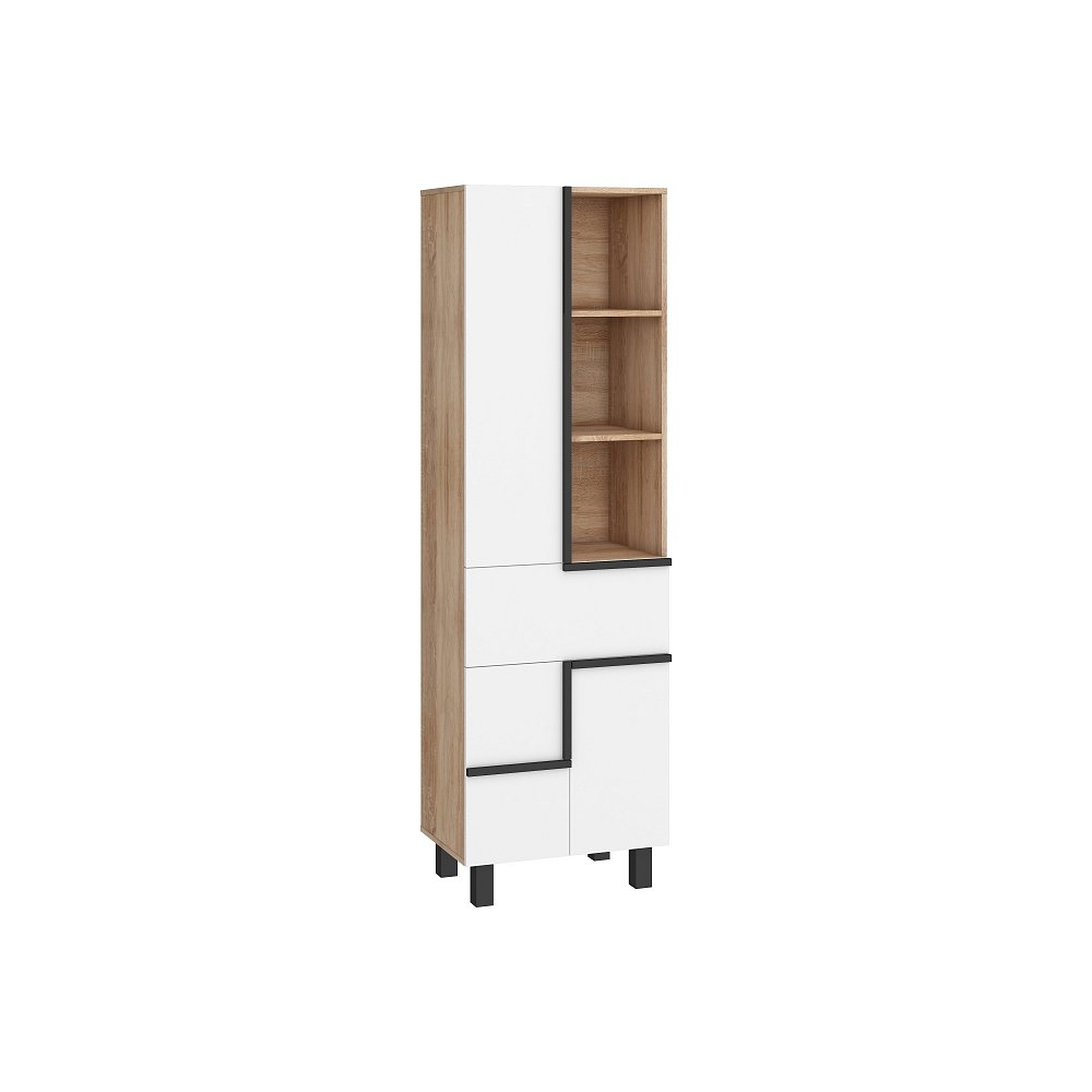 Regál je vybaven zásuvkou, skříňkou ve spodní části s jednou poličkou uvnitř, policovou částí a skříňkou s plnými dvířky, ve které jsou dvě poličky v horní části. Barva: - dub sonoma/bílá - lišty a nožky: černá Rozměr (šxvxh): 60 x 195 x 42 cm Výška nožek: 12 cm Materiál: - lamino o síle 16 mm s ABS hranami - dřevěné nožky Regál disponuje systémem tichého dovírání. Dodáváno v demontu. Záruka 5 let.