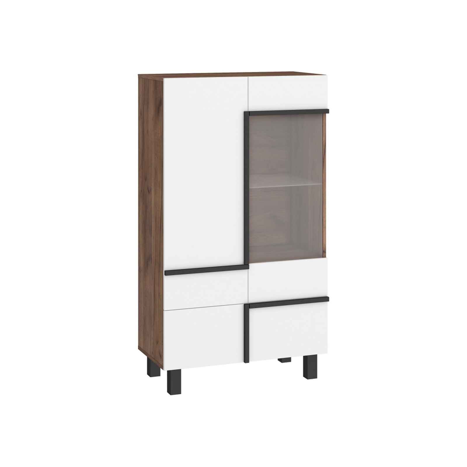Vitrína má ve spodní části velkou hlubokou zásuvku, za plnými dvířky najdete dvě poličky, v prosklené části je vybavená jednou skleněnou poličkou a dvěma poličkami z lamina. Barva: - craft tobaco/bílá - lišty a nožky: černá Rozměr (šxvxh): 80 x 142 x 42 cm Výška nožek: 12 cm Materiál: - lamino o síle 16 mm s ABS hranami - dřevěné nožky - sklo Vitrína disponuje systémem tichého dovírání. Dodáváno v demontu. Záruka 5 let.