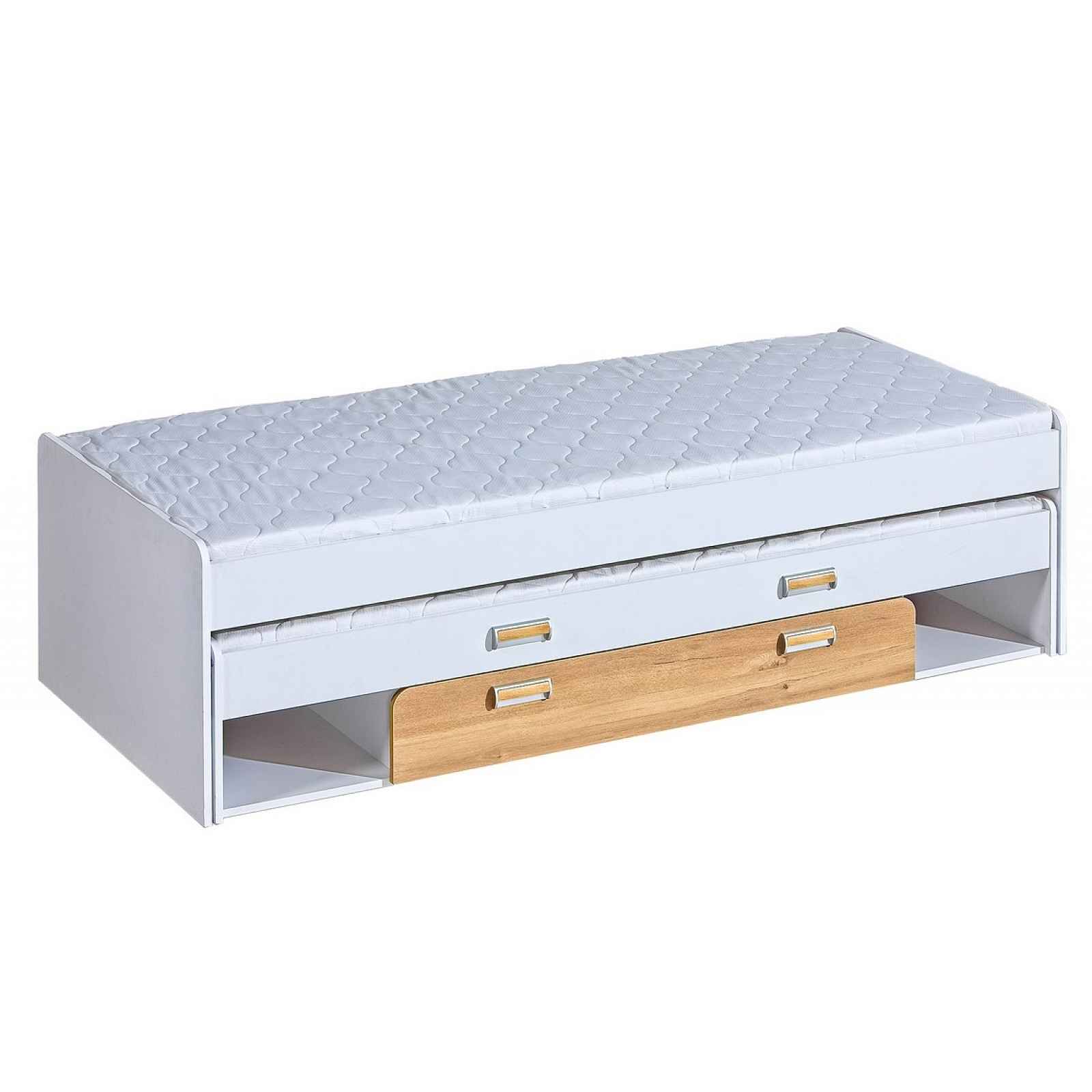 Systém se skládá z 16 prvků v různém barevném provedení. Tento široký výběr vám zaručí si sestavit nábytek podle svých představ. Celá řada se vyznačuje zaoblenými tvary. Barevné provedení: bílá/dub nash Dekorace je vytvořena z ABS pásky z PVC výrazné barvy. Nábytek je vyrobený z kvalitní laminátové desky o síle 16 - 18 mm. Plastové úchyty. Rozměry (šxhlxv): 86 x 203,5 x 55,5 cm. Rozměry zásuvky (šxhl): 110 x 76 cm Výška přistýlky od země: 35 cm Ložná plocha - horní postel: 80 x 200 cm. Ložná plocha - přistýlka: 80 x 195 cm. Součástí postele jsou 2 lamelové rošty a zásuvka na kolečkách. Dodání v demontu. Záruka 5 let.