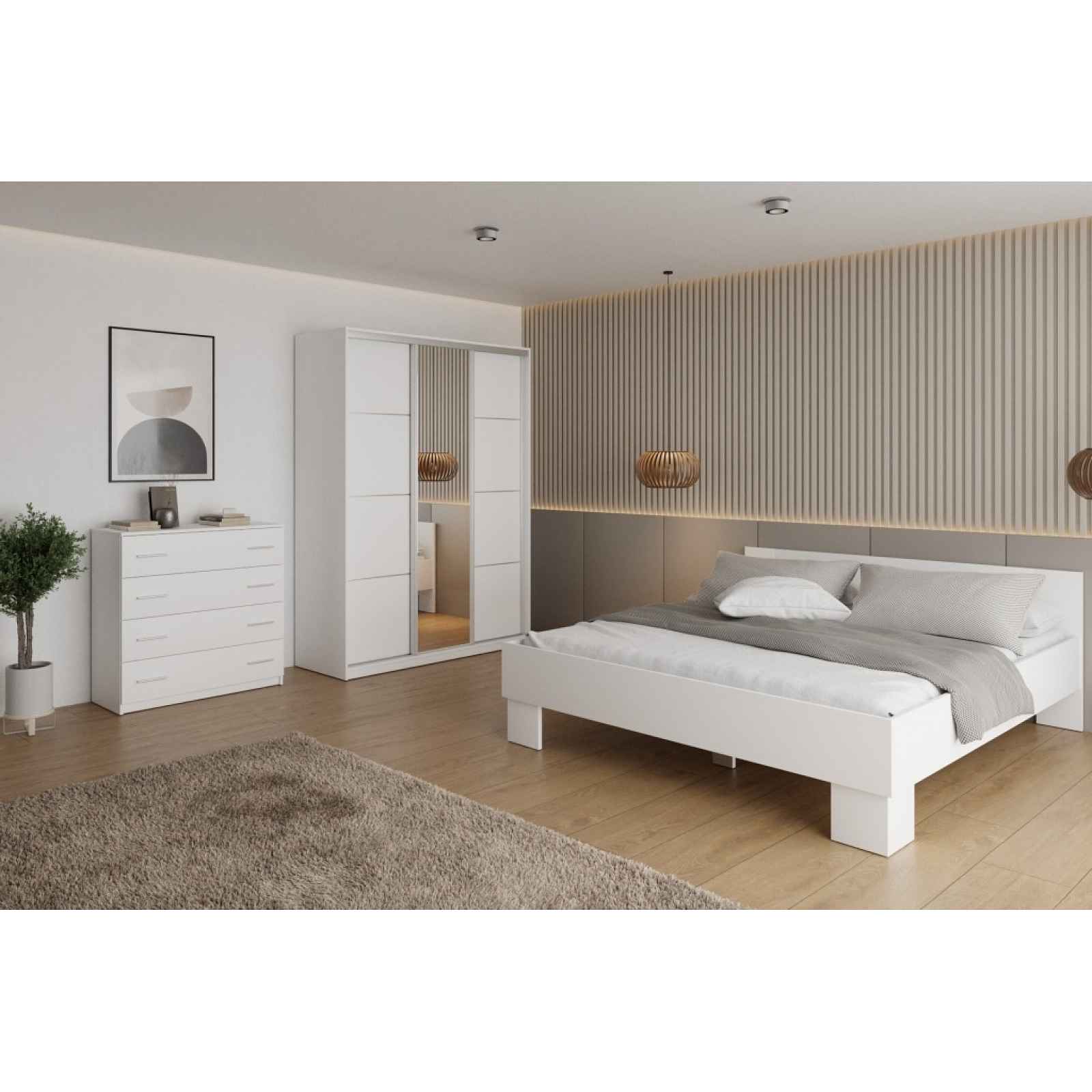 Ložnice Barva: bílá Materiál: lamino, melaminová hrana, rolničkové výsuvy Sestava zahrnuje (rozměry - šířka x výška x hloubka): - skříň s posuvnými dveřmi 150 x 205 x 56,3 cm - postel 180x200 cm - 185 x 75,5 x 204 cm - komoda 91 x 92 x 40 cm Postel je dodávaná bez roštu a matrace. Vhodný rozměr je 180x200 cm nebo dva kusy 90x200 cm. Ozdobné lišty, které jsou na dveřích skříně, není nutné na dveře instalovat. Můžete tak mít hladké dveře bez lišt. Dodáváno v demontu.