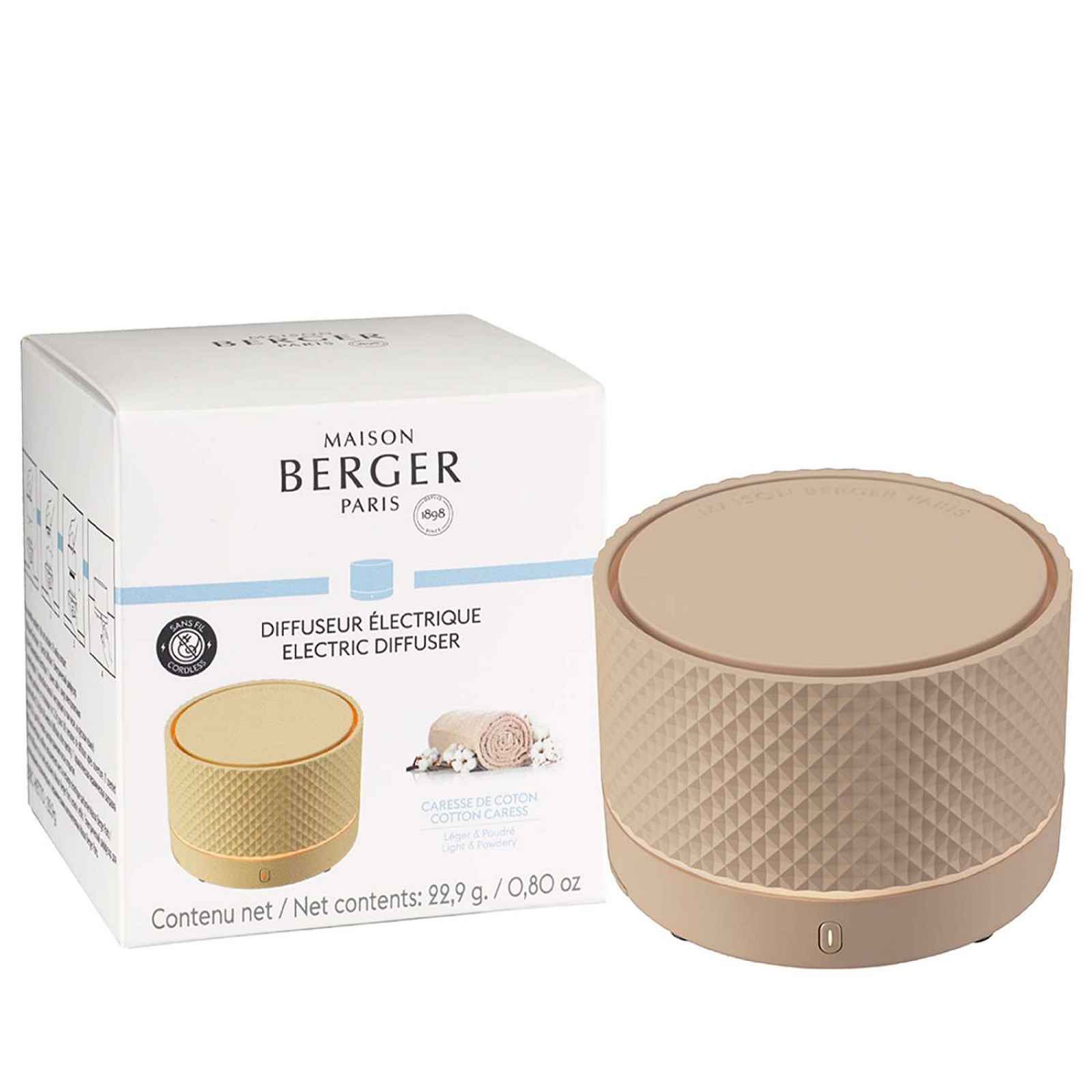 Elektrický přenosný difuzér Nomade od značky Maison Berger Paris v elegantním béžovém provedení zajišťuje rovnoměrné a bezpečné provonění prostoru bez otevřeného plamene. Součástí balení je keramická náplň s vůní Bavlněná péče. Zaujme vás kompaktními rozměry a snadností použití. Rozměry: průměr 8,2 cm, výška 5,9 cm. Doba provonění až 6–8 týdnů.Interiérový parfém Bavlněná péče je čistá, jemná a uklidňující vůně inspirovaná hebkostí čerstvě vypraného prádla a pocitem dokonalé čistoty. V úvodu se rozvíjejí něžné tóny růže doplněné lehkou vzdušností aldehydů. V srdci vůně se snoubí pomerančový květ s jemnými pudrovými akordy, které evokují klid a pohodlí. Základ tvoří hřejivá kombinace cedru, pižma a vanilky, jež dodává vůni měkkost, harmonii a dlouhotrvající uklidňující dojem.Balení obsahuje:1× elektrický aroma difuzér Nomade1× keramická vonná náplň1× USB napájecí kabel1× návod k použití