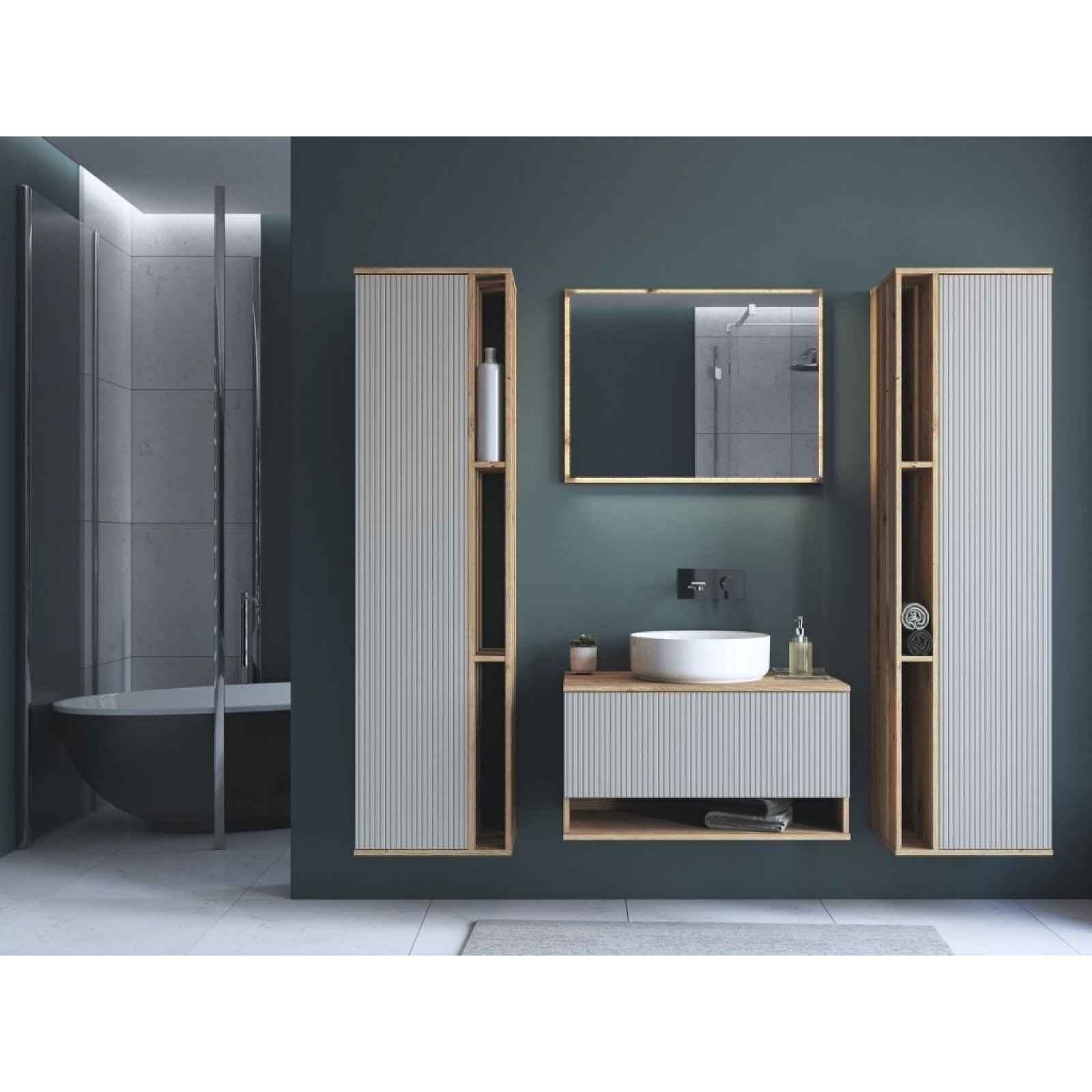 Koupelnová sestava Příklad jedné z možných sestav, kterou lze poskládat z jednotlivých dílů, které nabízíme i samostatně. Tato sestava obsahuje (šířka x výška x hloubka): - 2x vysoká závěsná skříňka 1D 32,6 x 164,8 x 34,8 cm - 2x boční police k vysoké závěsné skříňce 1D 45,4 x 168 x 35,4 cm - zrcadlo s LED osvětlením 80 x 60 x 36 cm - závěsná skříňka pod umyvadlo 80/1S 80 x 43 x 45 cm - umyvadlo Barva: - korpus: dub artisan - dvířka: matná kašmírová Materiál: - korpus: lamino - dvířka: MDF laminovaná - sklo (zrcadlo) Dodáváno v demontu.