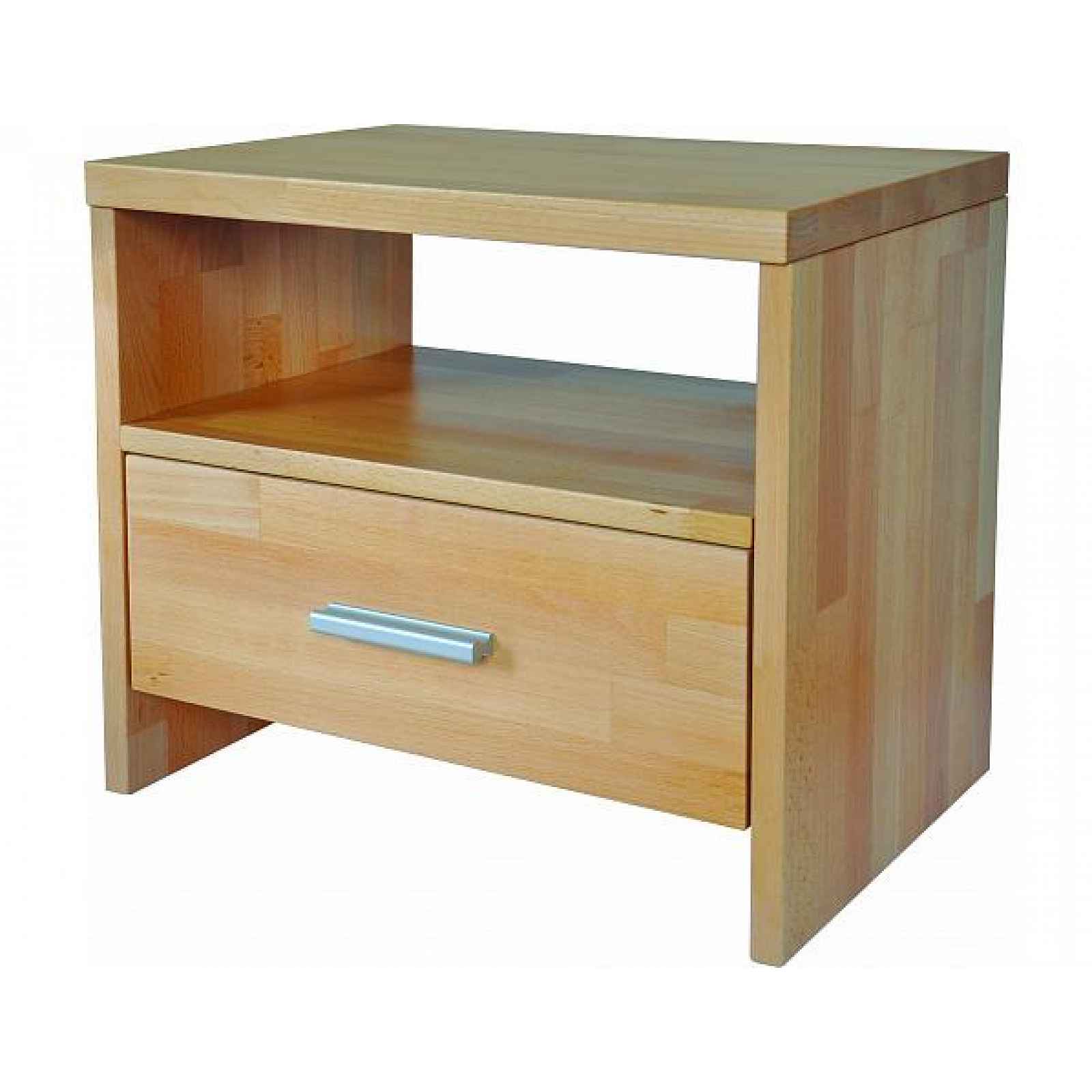 Masivní noční stolek slovenské výroby s 1 policí a se zásuvkou s kuličkovým výsuvem. Zásuvku zdobí hliníková úchytka. Noční stolek z masivního bukového dřeva o síle 30/20 mm vyniká originálním designem, kvalitním zpracováním a jednoduchou montáží. Noční stolek TNS3 dodáváme v demontu a je kombinovatelný nejlépe s postelemi z masivního bukového dřeva (viz související produkty). Uvedená cena odpovídá 1 ks stolku v základním provedení v přírodním buku. Za příplatek si můžete vybírat z více moření. Dále vám nabízíme bez příplatku volbu povrchové úpravy (viz varianty produktu). Rozměry: - šířka 50 cm - hloubka 35 cm - výška 42 cm Masivní buk je vnější (mladší) část bukového dřeva, výrazně světlejší v příčném řezu. Pro strom plní částečně zavlažovací funkci, obsah vody je tedy vyšší. S použitím povrchové úpravy vám bude přesto velmi dlouho sloužit. Bukové dřevo řadíme mezi tvrdé dřeviny. Svojí charakteristikou a vlastnostmi se řadí mezi nejčastější a nejkvalitnější přírodní materiály v nábytkářské výrobě.