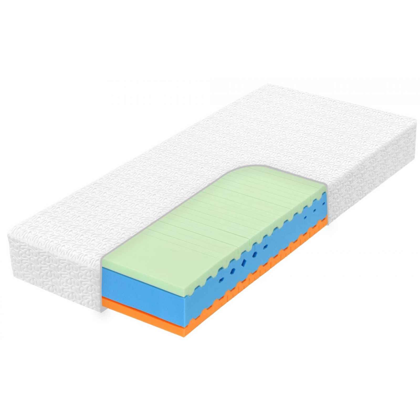 Špičková sendvičová matrace vyrobená z pružných a vzdušných hybridních pěn, které jsou pohodlné a vydrží. S funkcí ramenních kolébek, které chrání rameno. Špičková sendvičová matrace vyrobená z pružných a vzdušných hybridních pěn, které jsou pohodlné a vydrží. Matrace má funkci ramenních kolébek, které chrání rameno při spánku na boku. Elastický pratelný potah s přírodním vláknem a elastanem drží tvar. - sendvičová matrace - plocha 90×200 cm - výška matrace v potahu: cca 23 cm - doporučená nosnost: do 150 kg - oboustranná: strana tužší/strana měkčí – rozdílná tuhost a vlastnosti stran - strana 1: studená pěna - vyšší střední tuhost, 7 zón, vynikající prodyšnost díky otevřenější buněčné struktuře, nízké povrchové teplotní napětí (nepřehřívá), vysoká odrazová pružnost, zvýšená tuhost a odolnost, stupeň tuhosti: 3,5 (stupnice tuhosti: 1 měkká – 5 tuhá) - strana 2: hybridní pěna - střední tuhost, 7 zón, elastická - zvyšuje odrazovou pružnost, vzdušnost a pocitovou pevnost matrace, zajišťuje optimální klima, čímž napomáhá předcházet pocení, stupeň tuhosti: 3 (stupnice tuhosti: 1 měkká – 5 tuhá) - středová vrstva: hybridní pěna, funkce ramenních kolébek, které chrání rameno při spánku na boku - lepeno zdravotně nezávadnými švýcarskými lepidly SIMALFA SWISS na vodní bázi - potah kombinace ½ Gekon a ½ UNO: Gekon - prvotřídní potah si oblíbíte nejen proto, že je hebký, nadýchaný a velice příjemný na dotek, ale hlavně vysoce funkční, Uno- spodní část potahu z protiskluzové vrstvy, vhodná i pro postele s nedostatečným zapuštěním, potah snímatelný na zip, Gekon - praní na 60°C – vrch matrace, Uno - ruční praní - spodní část - vhodné i pro alergiky - vhodné uložení na: pevný laťkový rošt, pevný lamelový rošt, polohovatelný lamelový rošt - mechanický test: 80.000 cyklů - český výrobek