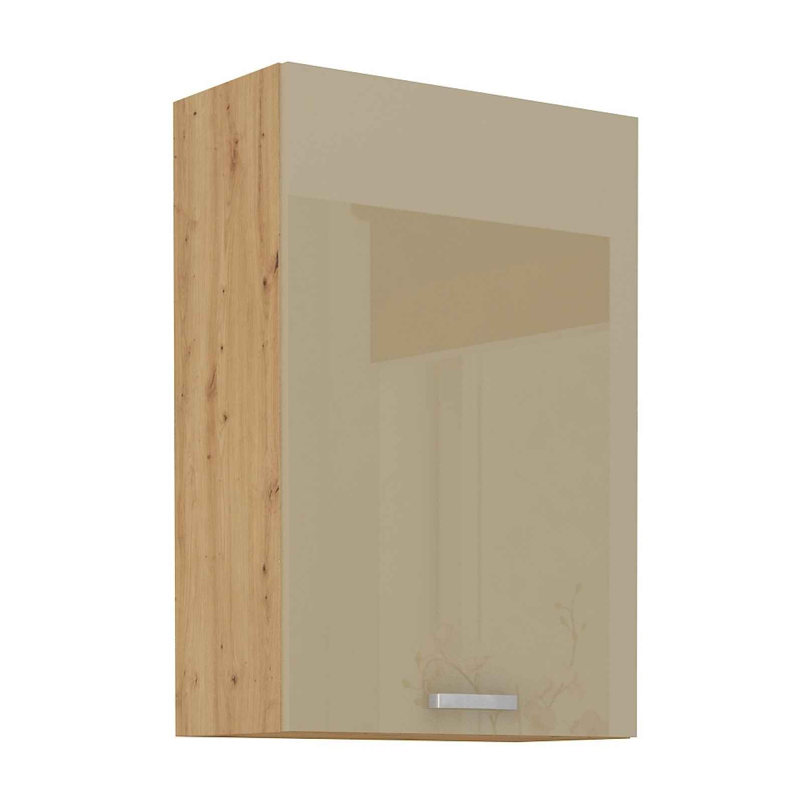 Skříňka horní 60 cm Vlastnosti skříňky: - má systém tichého dovírání dvířek - je univerzální, panty lze namontovat na levou či pravou stranu - má tři police Barva: - korpus: dub artisan - dvířka: cappuccino lesk - úchyt: stříbrný mat Rozměry (šxvxh): 60 x 90 x 31 cm Materiál: - korpus: lamino, melaminové hrany, záda korpusu HDF - dvířka: lamino, MDF, ABS hrany - úchyt: kov Dodáváno v demontu.