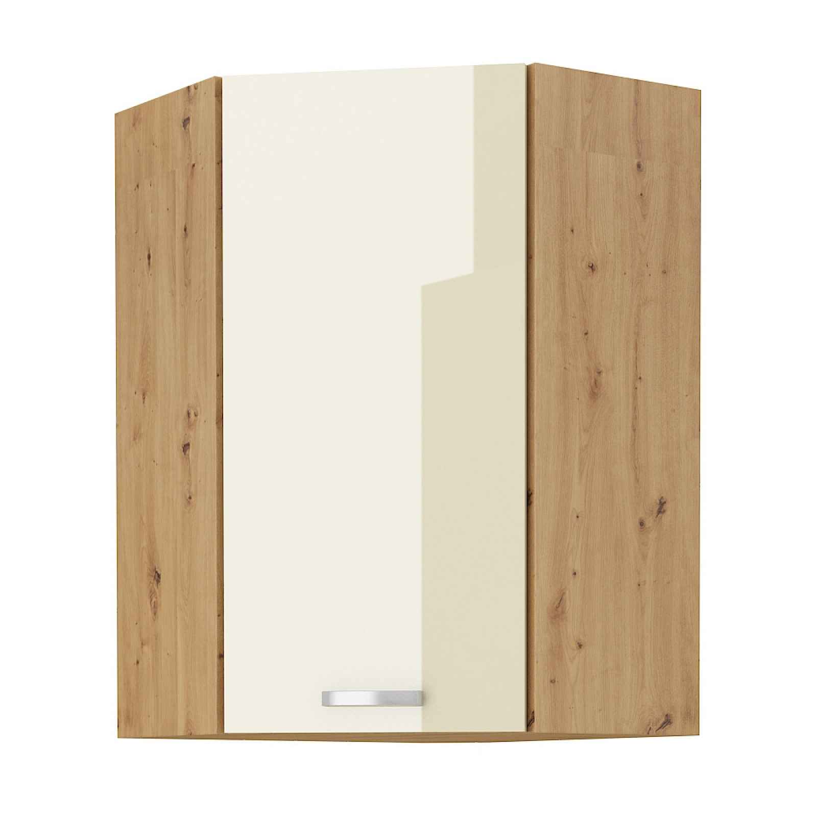 Skříňka horní 58 cm Vlastnosti skříňky: - má systém tichého dovírání dvířek - je univerzální, panty lze namontovat na levou či pravou stranu - má tři police Barva: - korpus: dub artisan - dvířka: krém lesk - úchyt: stříbrný mat Rozměry (šxvxh): 58,5/58,5 x 90 x 31 cm Materiál: - korpus: lamino, melaminové hrany, záda korpusu HDF - dvířka: lamino, MDF, ABS hrany - úchyt: kov Dodáváno v demontu.