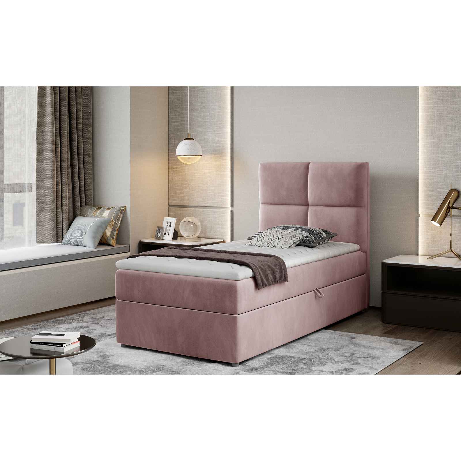 Moderní box spring postel Akční cena platí pro potah na hlavní fotografii Žinilka Monolith - příjemná na dotek a odolná plyšová látka. Látka je pokryta hydrofobní vrstvou, která chrání před rychlou absorpcí rozlité kapaliny do struktury nábytku. Monolith je látka vysoce odolná proti vyblednutí a žmolkování. Látka se vyznačuje stínováním materiálu. Postel je dodávána včetně matrací Součástí je úl. prostor přístupný z boku postele Celková nosnost je 120kg Postele typu boxspring jsou vhodně skládané z různých vrstev materiálů a systémů, které vytváří perfektní místo pro spánek a odpočinek. Výška horní matrace zajišťuje pohodlné zvednutí i dosednutí. Předností boxsprings postelí je konstrukční provedení postele, které se skládá z několika částí. Nejdůležitější částí je spodní box postele, který tvoří dřevěný box (úložný prostor), na něm uložená pružinová matrace typu Bonell a na ní pěnový topper. Výsledkem tohoto složení je neobyčejně vysoká zdvihová výška celkové postele. Tato zdvihová výška nám zaručuje dokonalé okopírování fyziologického tvaru těla, kvalitní relaxaci při odpočinku a spánku. ROZMĚRY: 90x210x108cm Ložná plocha: 90x200cm Výška ložné plochy: 53cm