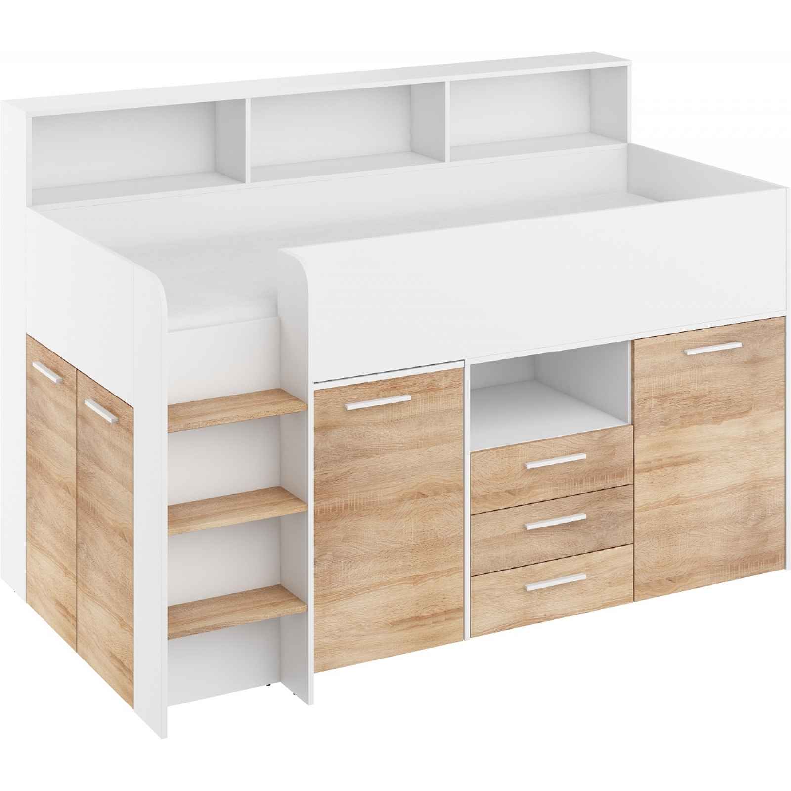 Multifunkční patrová postel, levá (schůdky na levé straně)Postel je šikovným řešením do malých interiérů. Předností postele je spací prostor a zároveň dostatek úložného prostoru, aniž by zabírala mnoho místa v pokoji. Chytře navržený vysouvací psací stůl splní nároky vašeho školáka, ale nebude zabírat místo při hraní, protože jej můžete snadno zasunout pod postel. Matrace není součástí postele, doporučený rozměr je 80x200 cm a maximální výška 12 cm. Součástí lůžka je pevná deska, nemusíte tedy objednávat rošt. Barva: - bílá/dub sonoma - úchytky: stříbrná Rozměr (šxvxh): 206 x 138 x 120 cmLožná plocha (hxš): 80 x 200 cm Materiál: lamino o síle 16 mm s ABS hranami - úchytky: tvrzený plast Nosnost: max. 90 kg Dodáváno v demontu. Záruka 5 let.