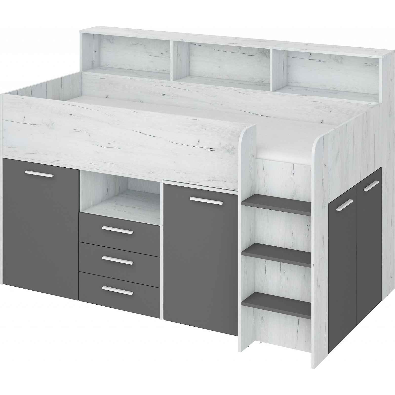 Multifunkční patrová postel, pravá (schůdky na pravé straně)Postel je šikovným řešením do malých interiérů. Předností postele je spací prostor a zároveň dostatek úložného prostoru, aniž by zabírala mnoho místa v pokoji. Chytře navržený vysouvací psací stůl splní nároky vašeho školáka, ale nebude zabírat místo při hraní, protože jej můžete snadno zasunout pod postel. Matrace není součástí postele, doporučený rozměr je 80x200 cm a maximální výška 12 cm. Součástí lůžka je pevná deska, nemusíte tedy objednávat rošt. Barva: - craft bílý/grafit - úchytky: stříbrná Rozměr (šxvxh): 206 x 138 x 120 cmLožná plocha (hxš): 80 x 200 cm Materiál: lamino o síle 16 mm s ABS hranami - úchytky: tvrzený plast Nosnost: max. 90 kg Dodáváno v demontu. Záruka 5 let.
