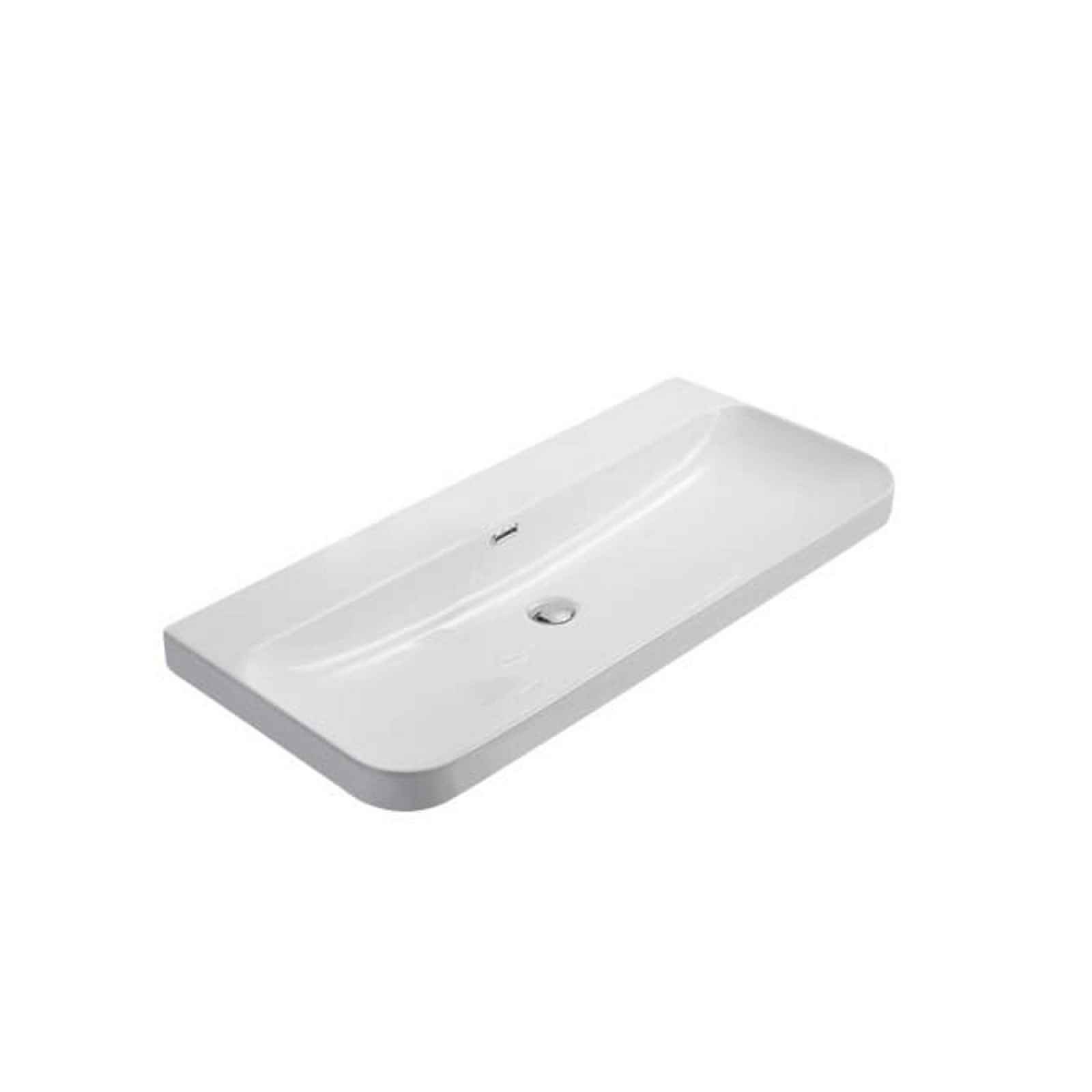 Nábytkové umyvadlo v bílé barvě s otvorem pro baterii uprostřed o šířce 100,6 cm a hloubce 46,3 cm. Balení bez sifonu a baterie.