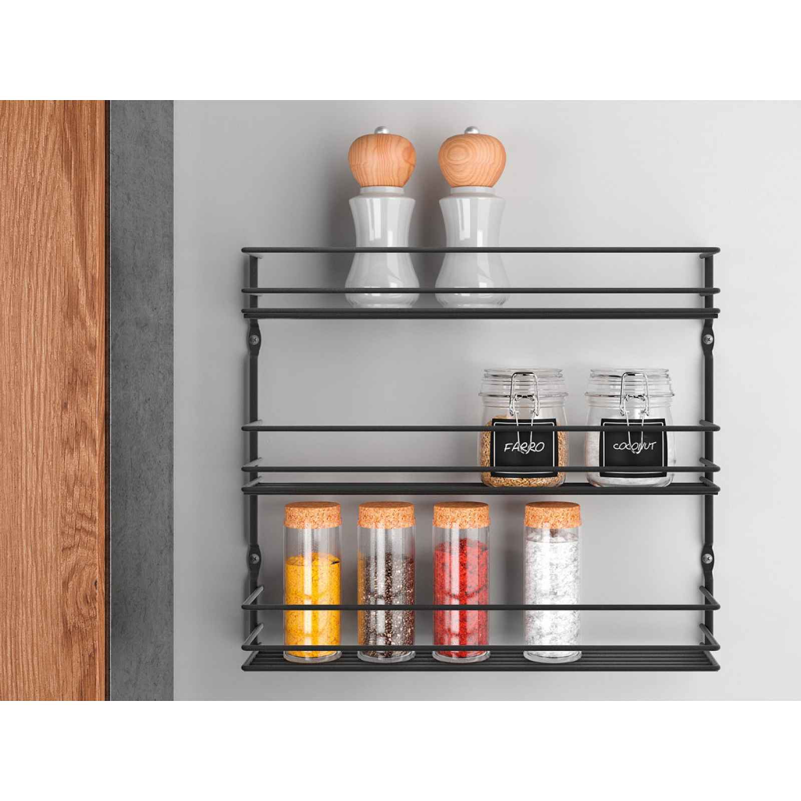 Nástěnný třípatrový stojan na kořenky z černého kovu šetří místo a pomáhá udržet vaši kuchyni dokonale přehlednou a uspořádanou. Kovový nástěnný třípatrový regál v elegantním černém provedení nabízí praktický a přehledný prostor pro mlýnky, skleněné dózy i klasické kořenky, které uvolní místo na pracovní desce. Díky organizéru budete mít své oblíbené chutě a vůně vždy po ruce a přehledně uspořádané. Díky exkluzivní povrchové úpravě Metaltex TouchTherm je polička vysoce odolná proti korozi i nárazu a navíc je antistatická. - nástěnný stojan - materiál: kov - povrchová úprava: matná černá (TouchTherm - vzhled lávového kamene) - rozměr: 36x32x8 cm - odolný proti korozi, nárazuvzdorný, antistatický povrch - 3 x police (ideální na kořenky a další kuchyňské potřeby) - univerzální montáž: na stěnu, na skříňku nebo do dveří (montážní materiál není součástí balení) - úspora místa díky vertikálnímu systému skladování nad pracovní deskou