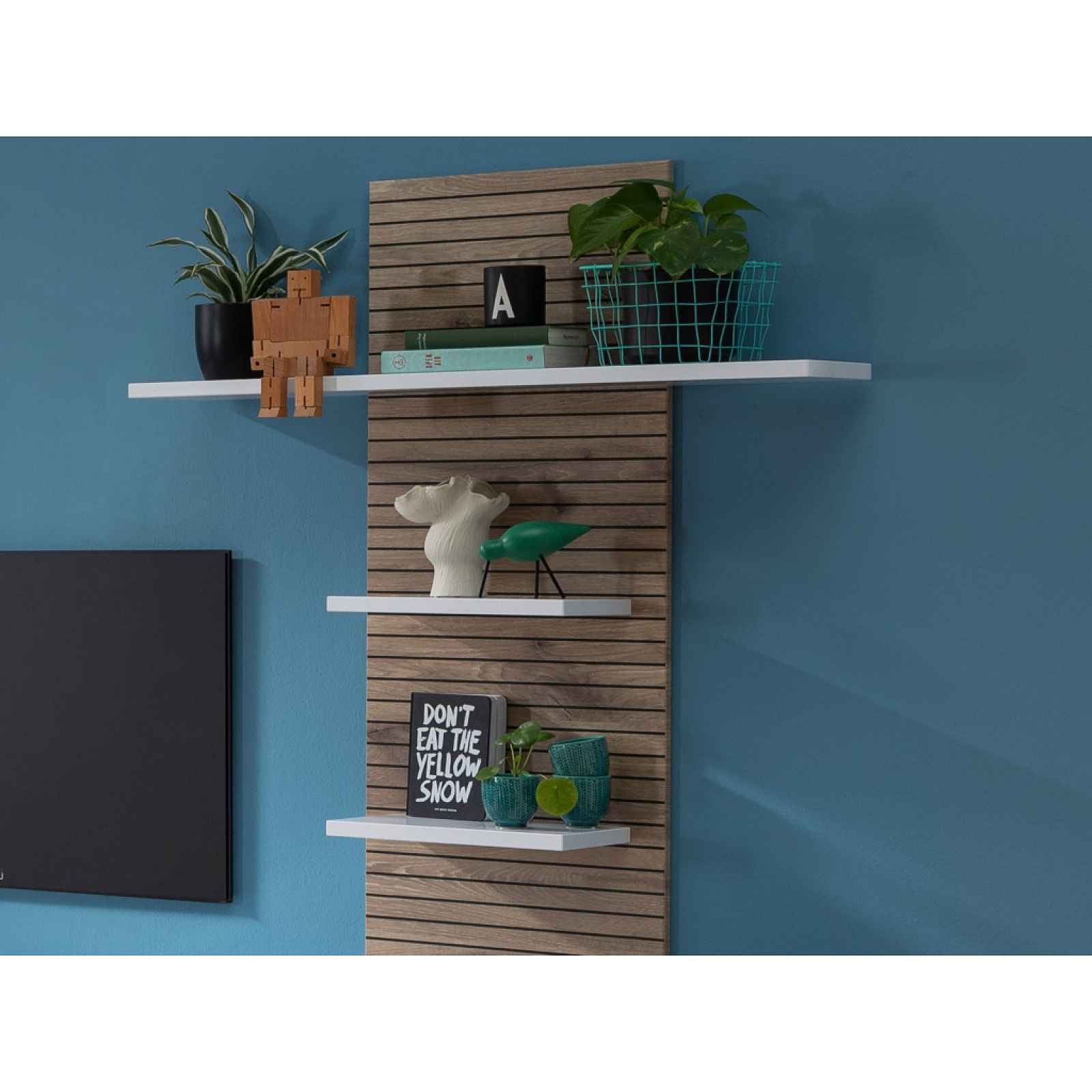 Nástěnný panel s policemi Rovigo – moderní, praktický a útulný nábytek. Bílá mat v kontrastu s dubem nox s lamelovým efektem vypadá skvěle v každém interiéru. Nástěnný panel s policemi z kolekce Rovigo – nábytek pro ty, kteří chtějí mít domov zařízen moderně, prakticky a zároveň útulně. Čisté bílé matné poličky skvěle kontrastují s hřejivými tóny dubového dřevodekoru v zajímavé optice s lamelovým efektem. - nástěnný panel s policemi z kolekce Rovigo - materiál: laminovaná dřevotříska 16 mm/22 mm, kov, plast - dekor: bílá mat/dub nox - zajímavá optika s lamelovým efektem (rovný povrch) - minimalistický a zároveň moderní a útulný styl - šířka zádového panelu: 100 cm - 3 x police - pro zavěšení na stěnu (zadní 4-bodové zavěšení) - bez osvětlení - kvalitní zpracování - doporučená nosnost každé police do 3 kg - certifikát výrobku FSC (dřevěný materiál pocházející z ekologicky obhospodařených certifikovaných lesů) - dodáváno v demontu