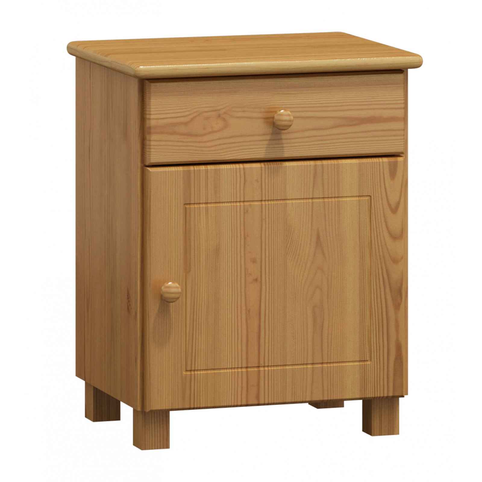 Noční stolek se zásuvkou a dvířky Materiál: masiv borovice Barva moření: olše Rozměry (výška x šířka x hloubka): 54 x 43 x 33 cm Dodáváno v demontu.