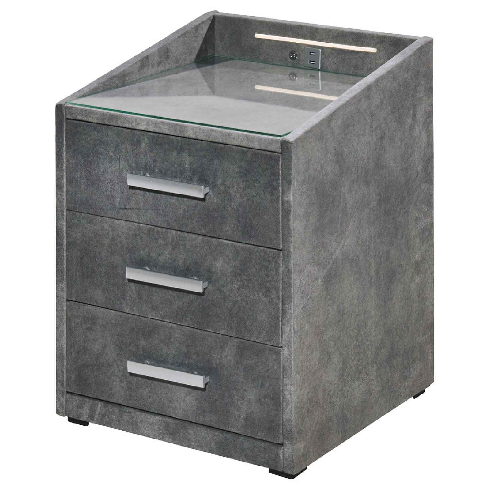 Noční stolek v šedohnědém potahu, se skleněnou deskou, 3 zásuvkami, plastovými úchytkami ve stříbrné barvě, LED osvětlením a USB připojením.Š/V/H: cca 47/61/46 cm
