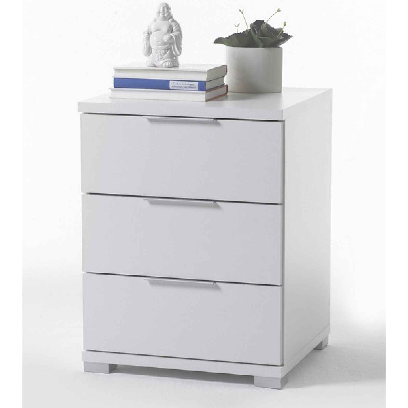 Moderní noční stolek s komfortně vyšší konstrukcí se ideálně hodí k vyššímu lůžku. - materiál: laminovaná dřevotříska 15 mm/22 mm, kov, plast - barva korpus: bílý mat - barva přední plochy: bílý mat - vodorovné úchyty: tvrzený plast, šedá alu barva (16 cm široký profil) - přízemní nožky: obdélný profil, šedá alu barva - 3 x zásuvka (kovové boční pojezdy) - moderní minimalistický styl - komfortně vyšší konstrukce - ideální kombinace k vyššímu lůžku - dodáváno v demontu