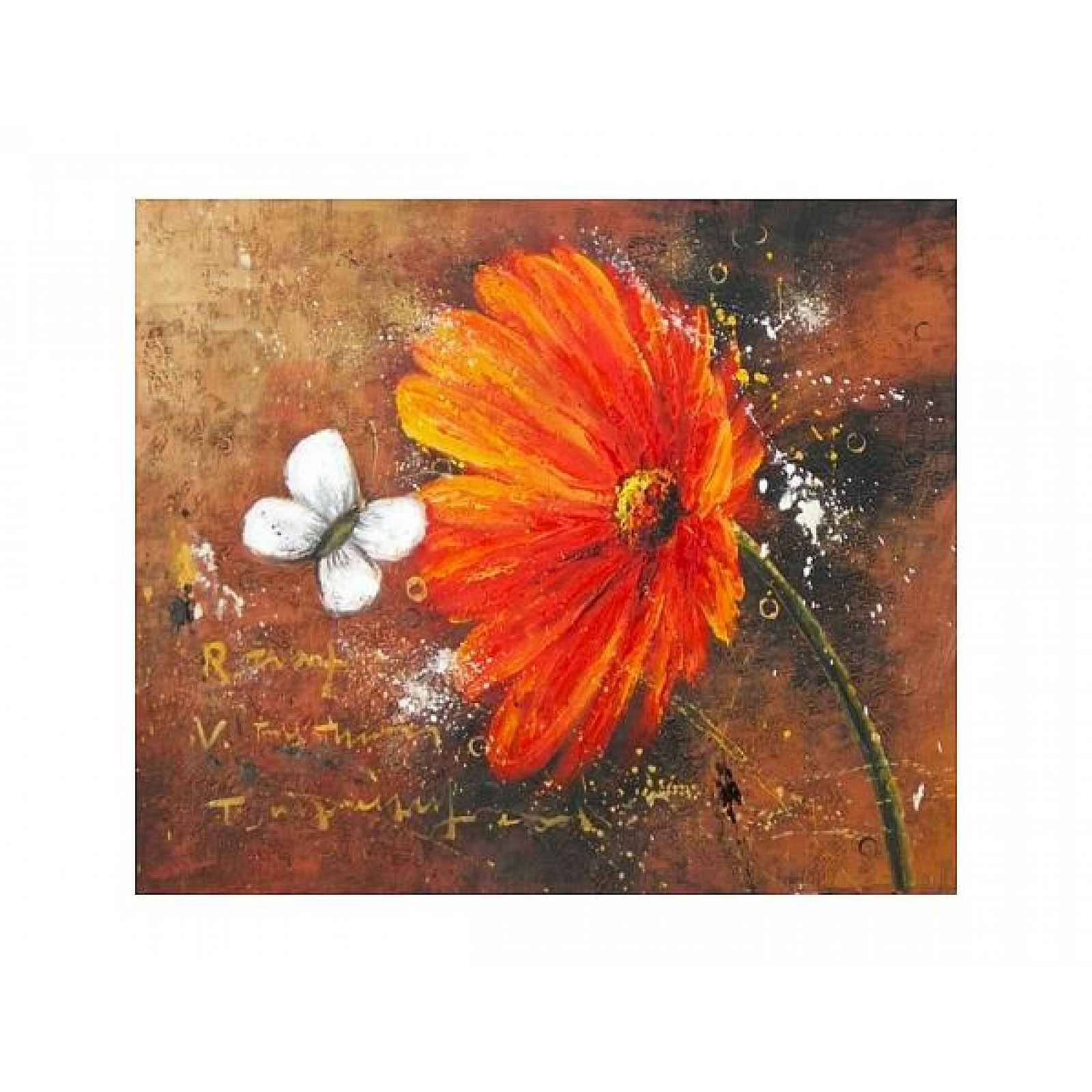 Ručně malovaný obraz olejovými barvami na pravém malířském plátně, vypnutý v dřevěném rámu. Hlavním motivem je oranžový květ s bílím motýlem na hnědém pozadí. Obrazy je možné zarámovat do dřevěného ozdobného rámu, nebo jej opatřit dřevěnou ozdobnou lištou, nabídku naleznete v sekci Rámy a rámování. V případě zájmu jsme schopni namalovat obrazy na zakázku dle Vaší předlohy. Velikost 50 cm × 60 cmPříplatek označovaný ve variantách písmenem b je za vyšší kvalitu provedení.